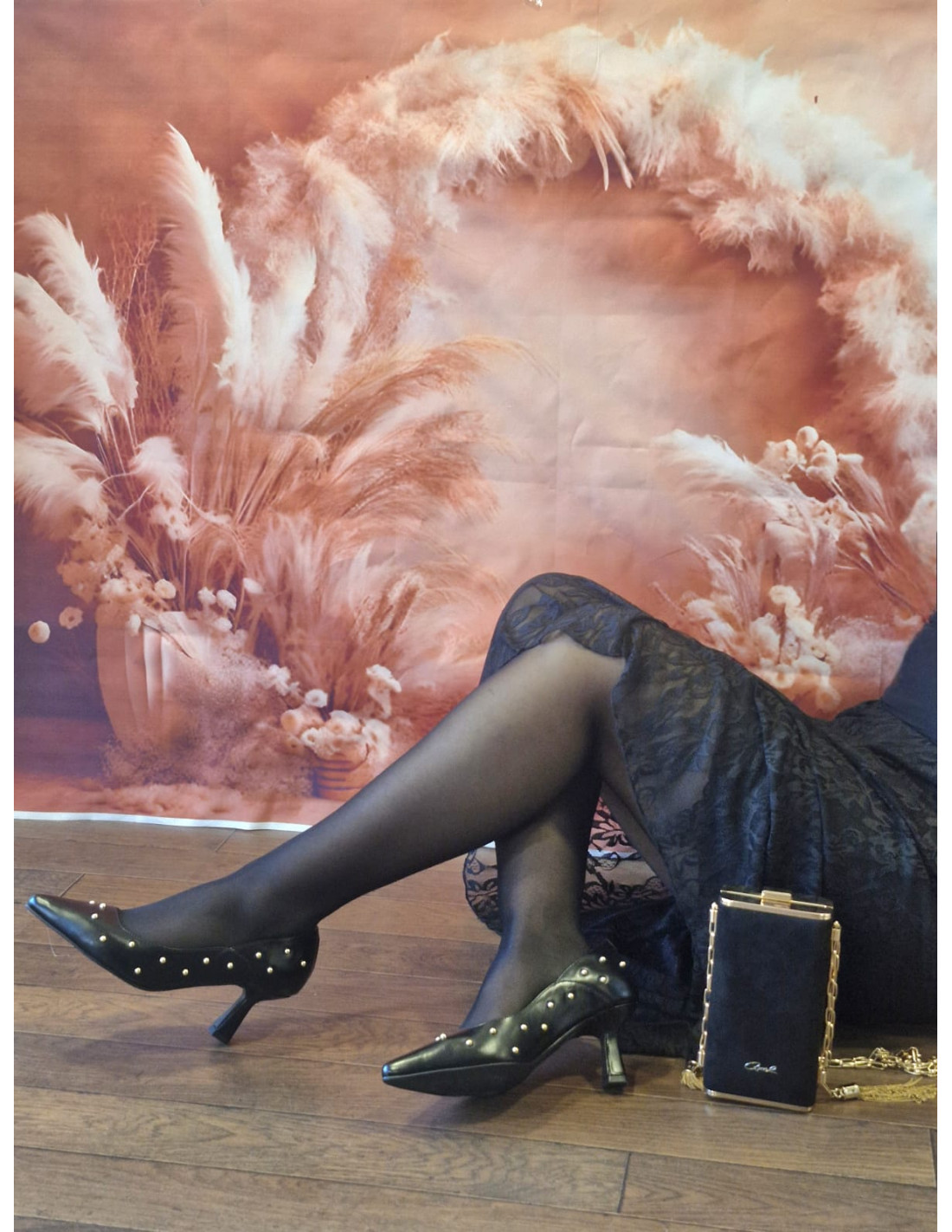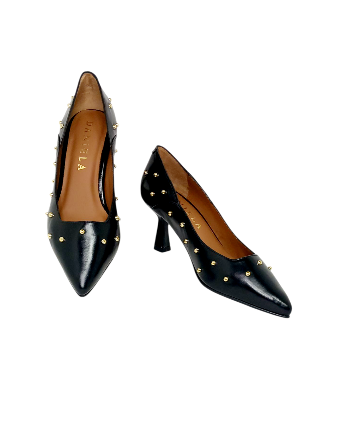 Zapato corte salón para mujer, elaborado en piel lisa en tono negro con detalles de tachuelas doradas y acabado en punta redondeada con escote cuadrado.