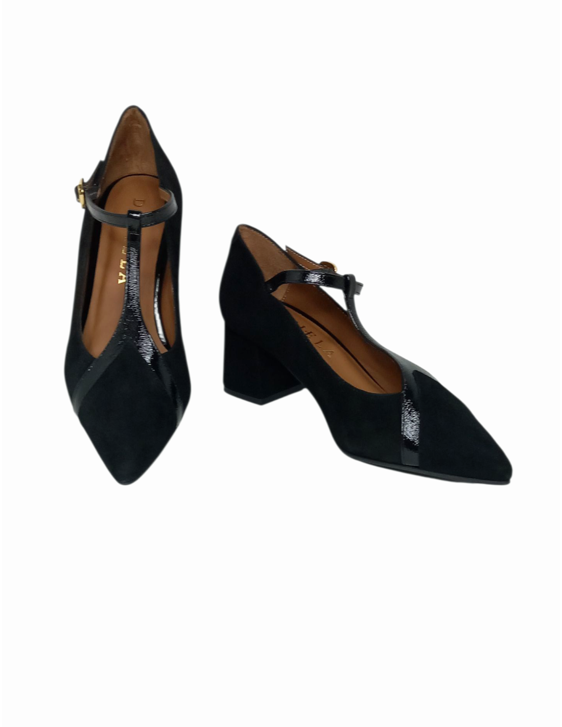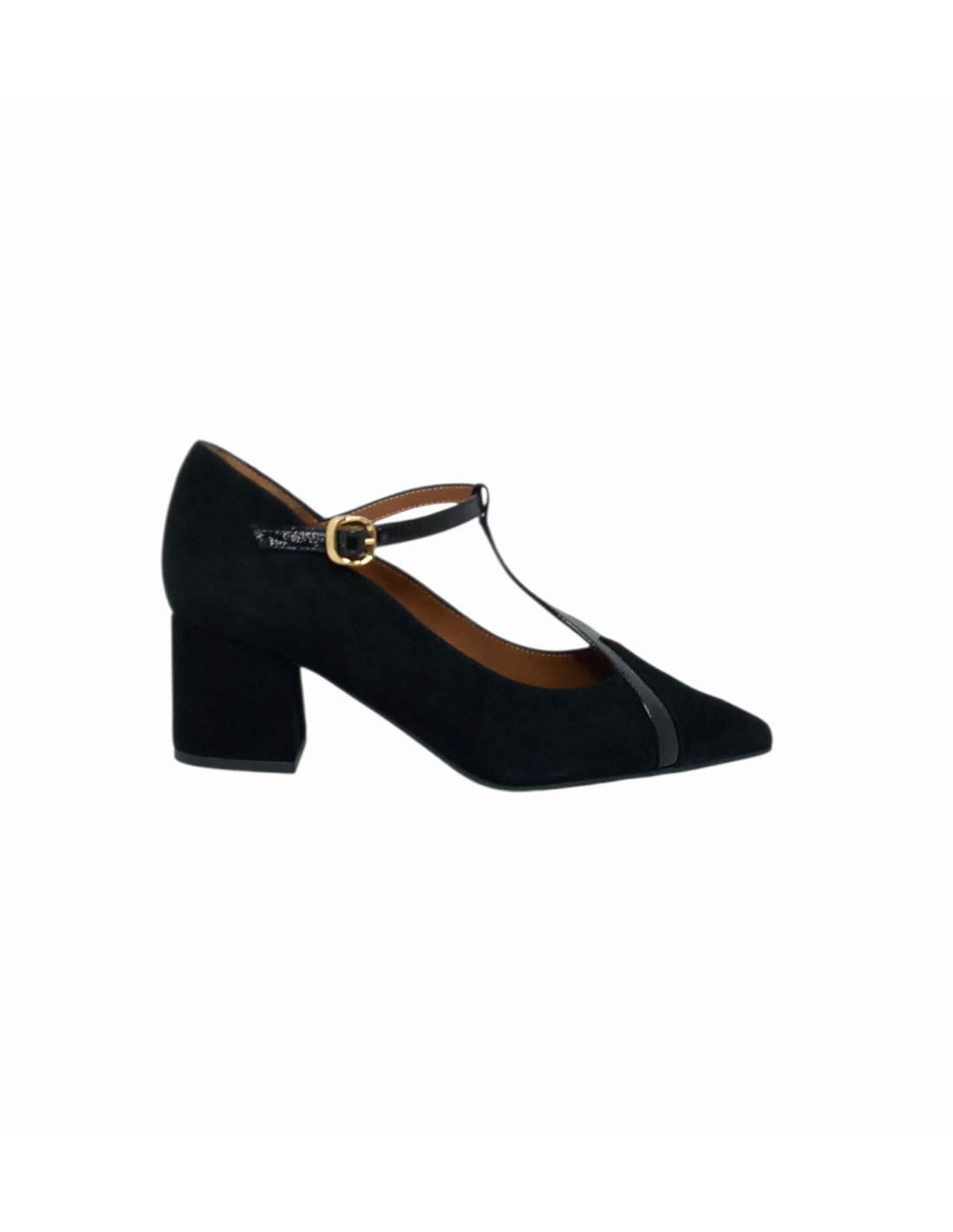 Zapato corte salón con tira en el empeine y pulsera en la zona del tobillo, elaborado en ante piel con detalles en charol, todo de color negro.