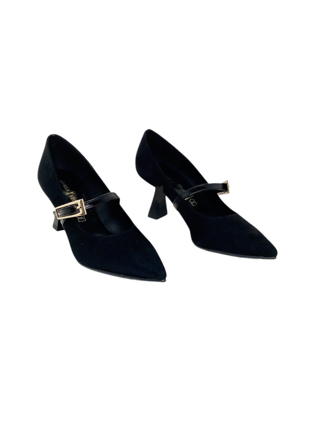 Zapato corte salón para mujer de la marca Daniela Vega fabricado en antelina en color negro con pulserita de charol en la zona del empeine con una elegante hebilla ajustable dorada.