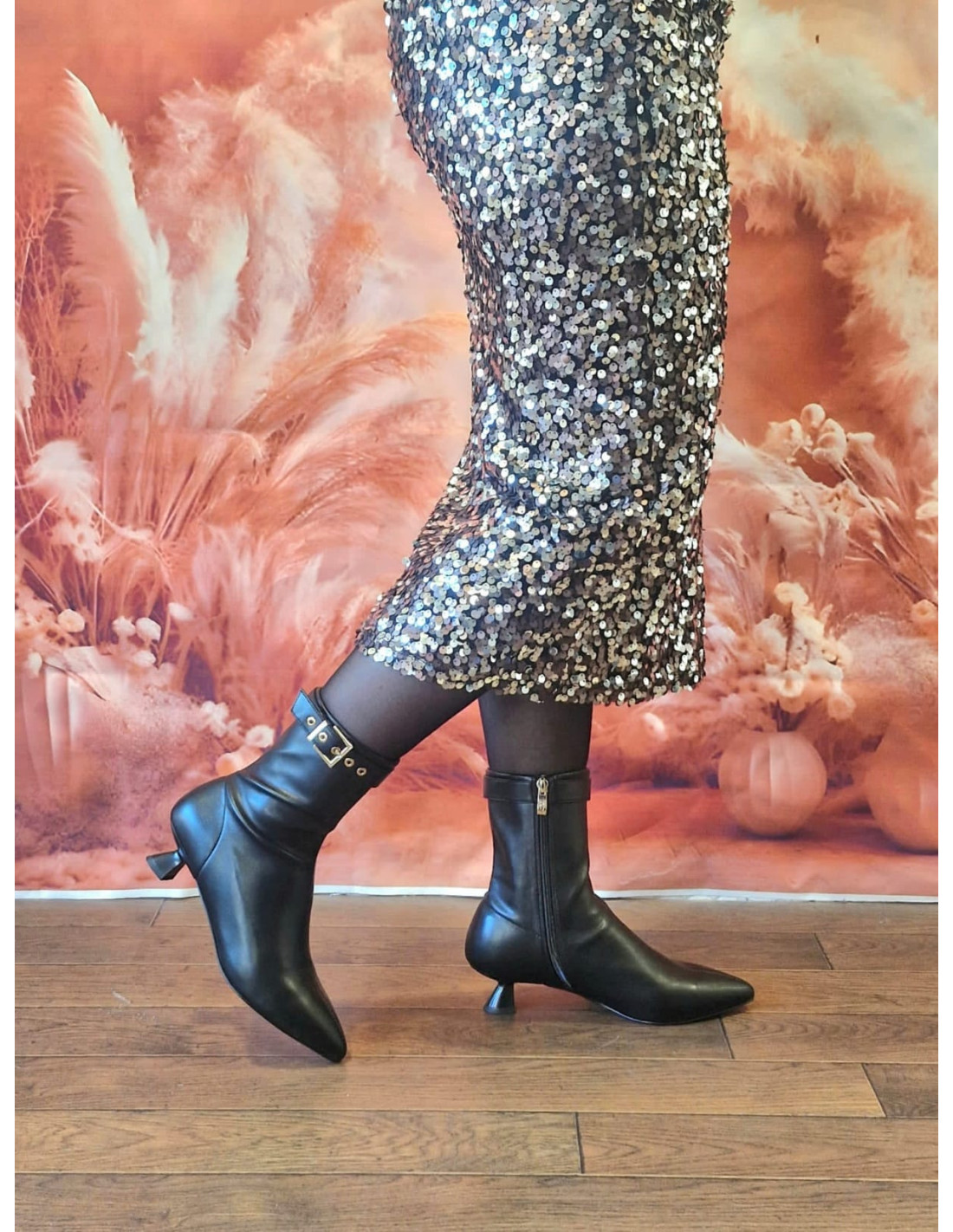 Botín efecto piel elástica de color negro, adornado con una pulsera con hebilla dorada ajustable en la parte superior.