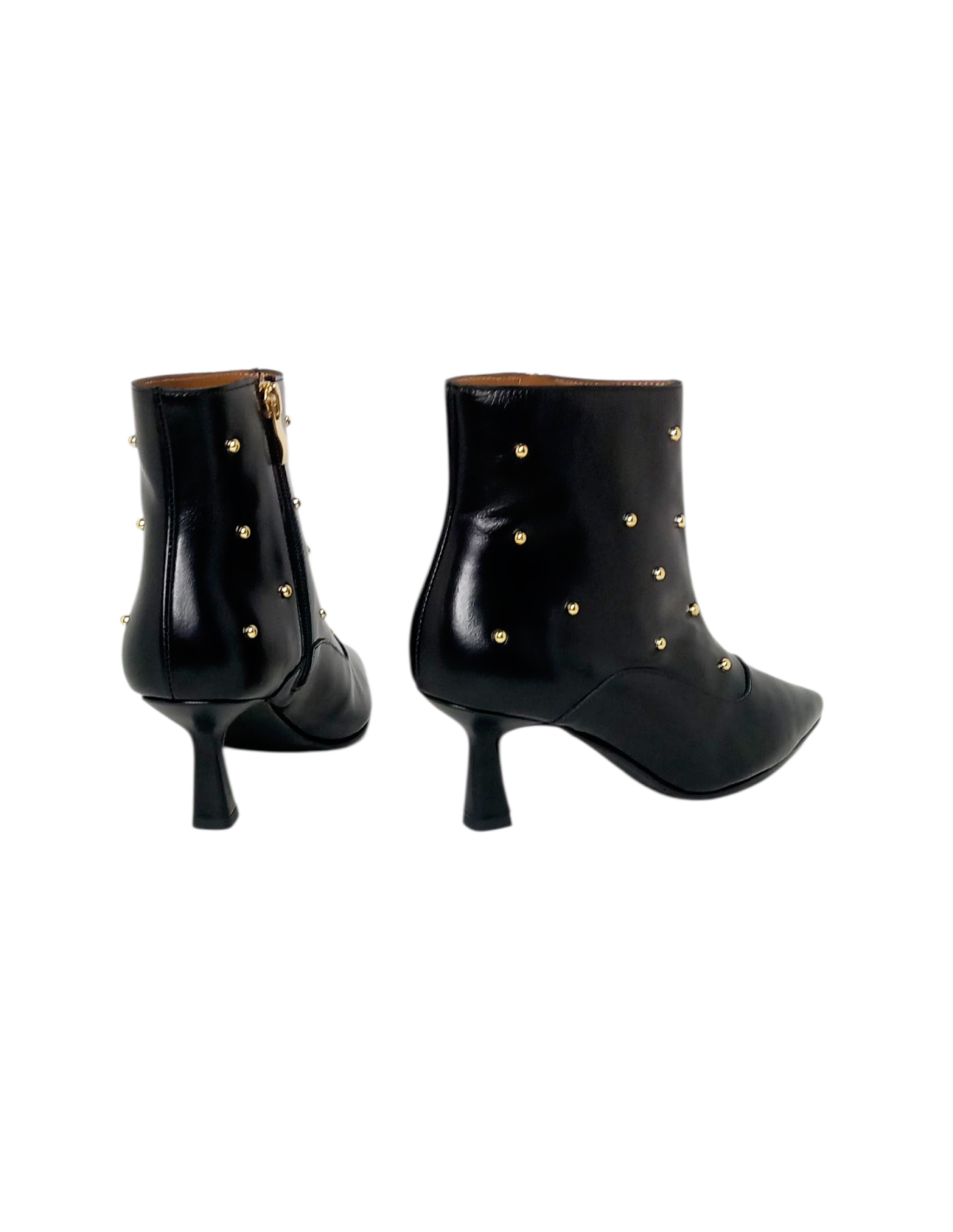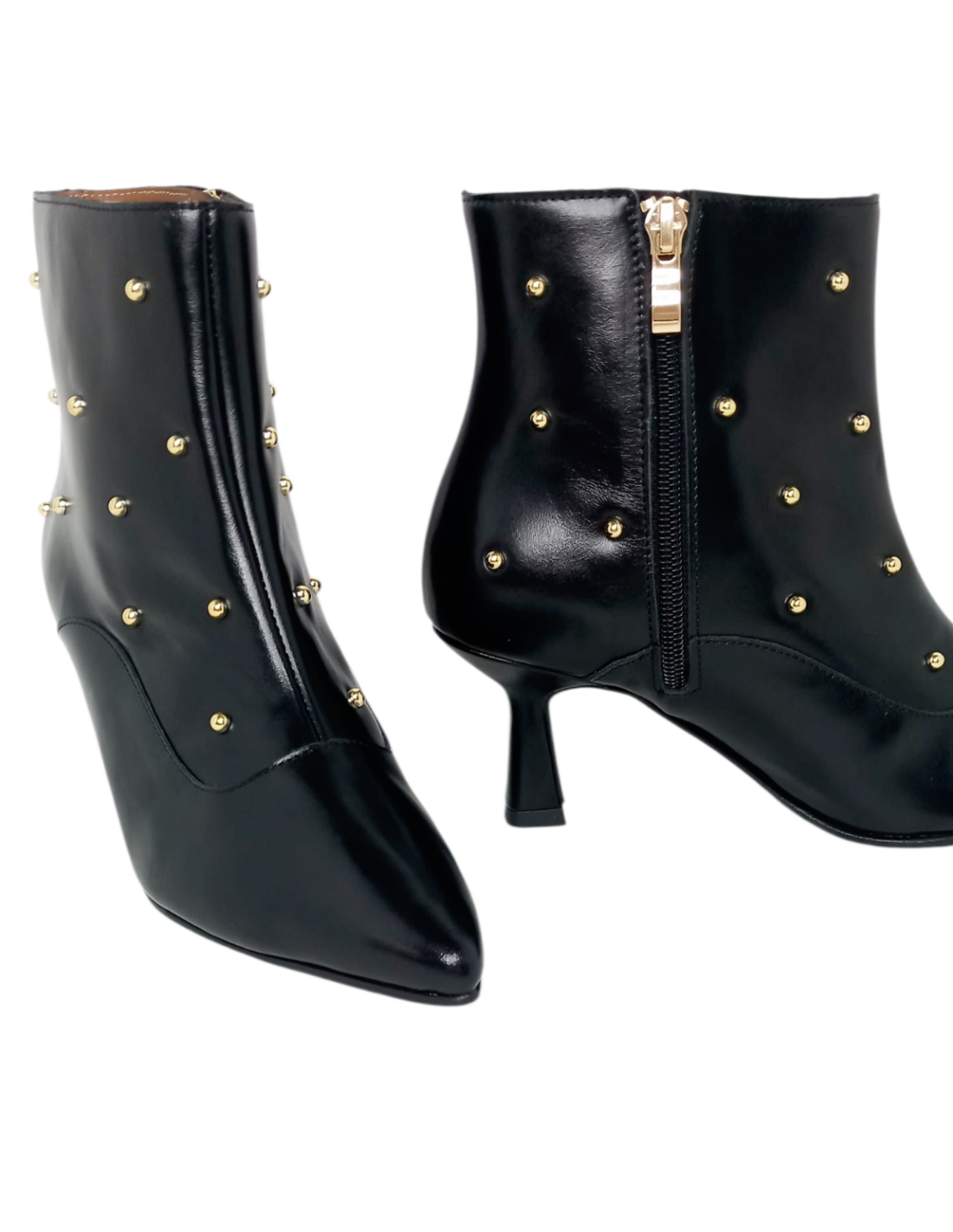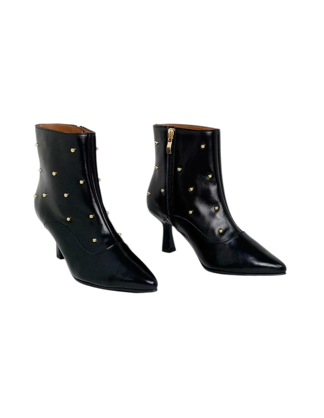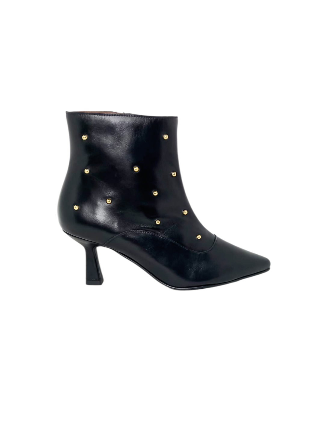 Botín de diseño elegante fabricado en piel de color negro adornado con tachuelas doradas y acabado en punta fina.