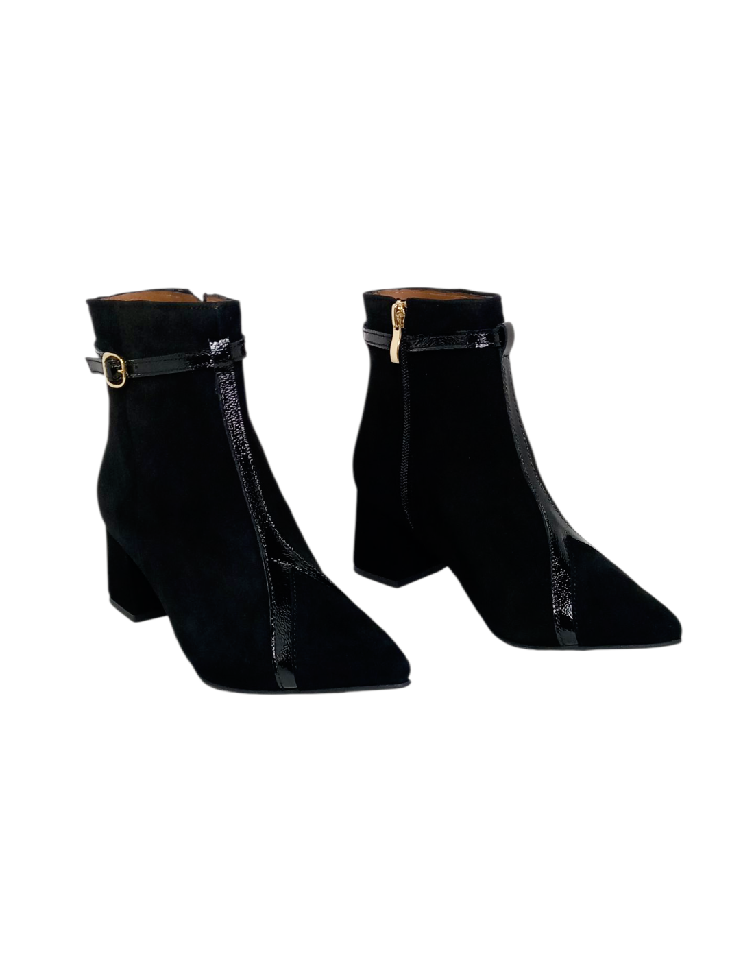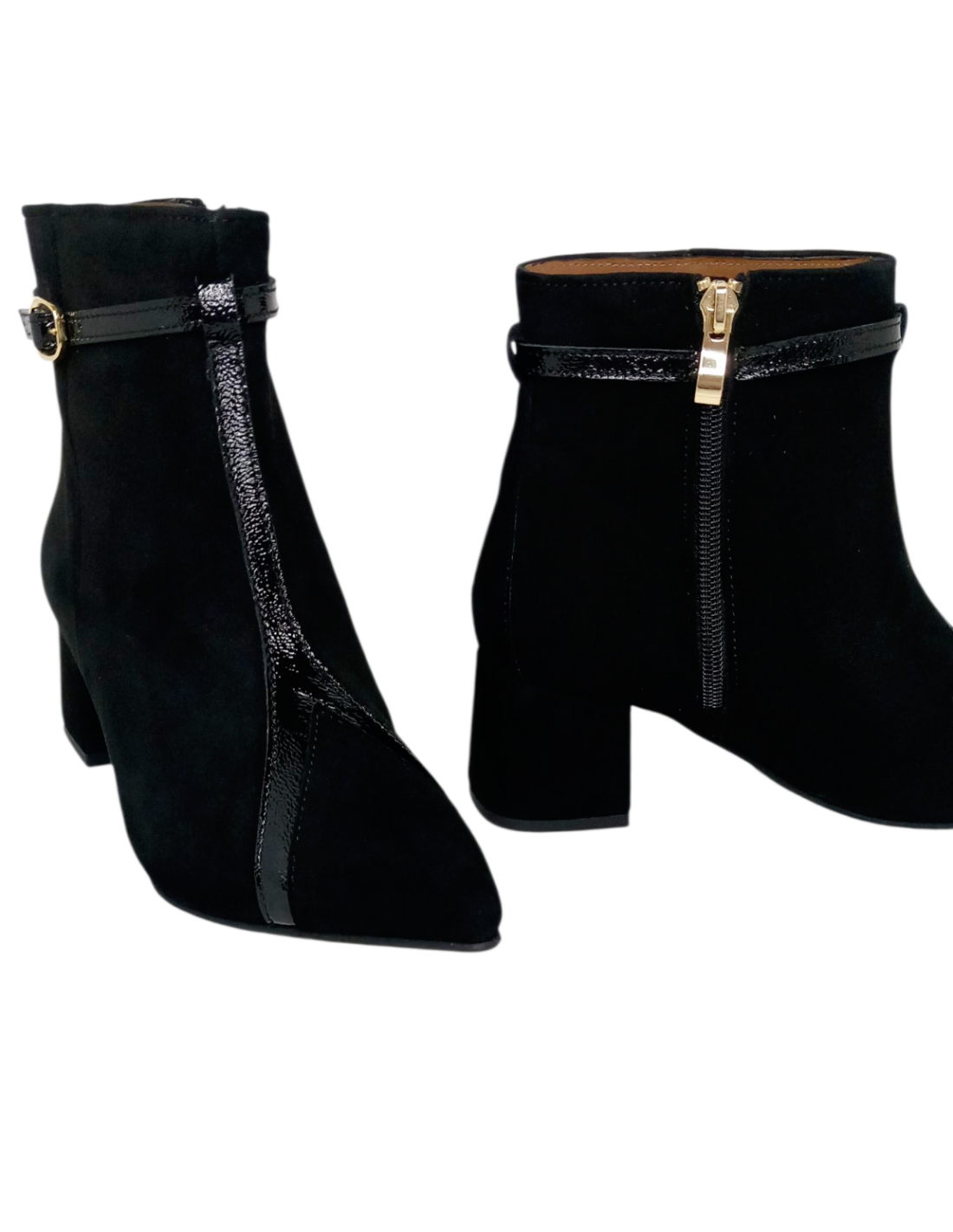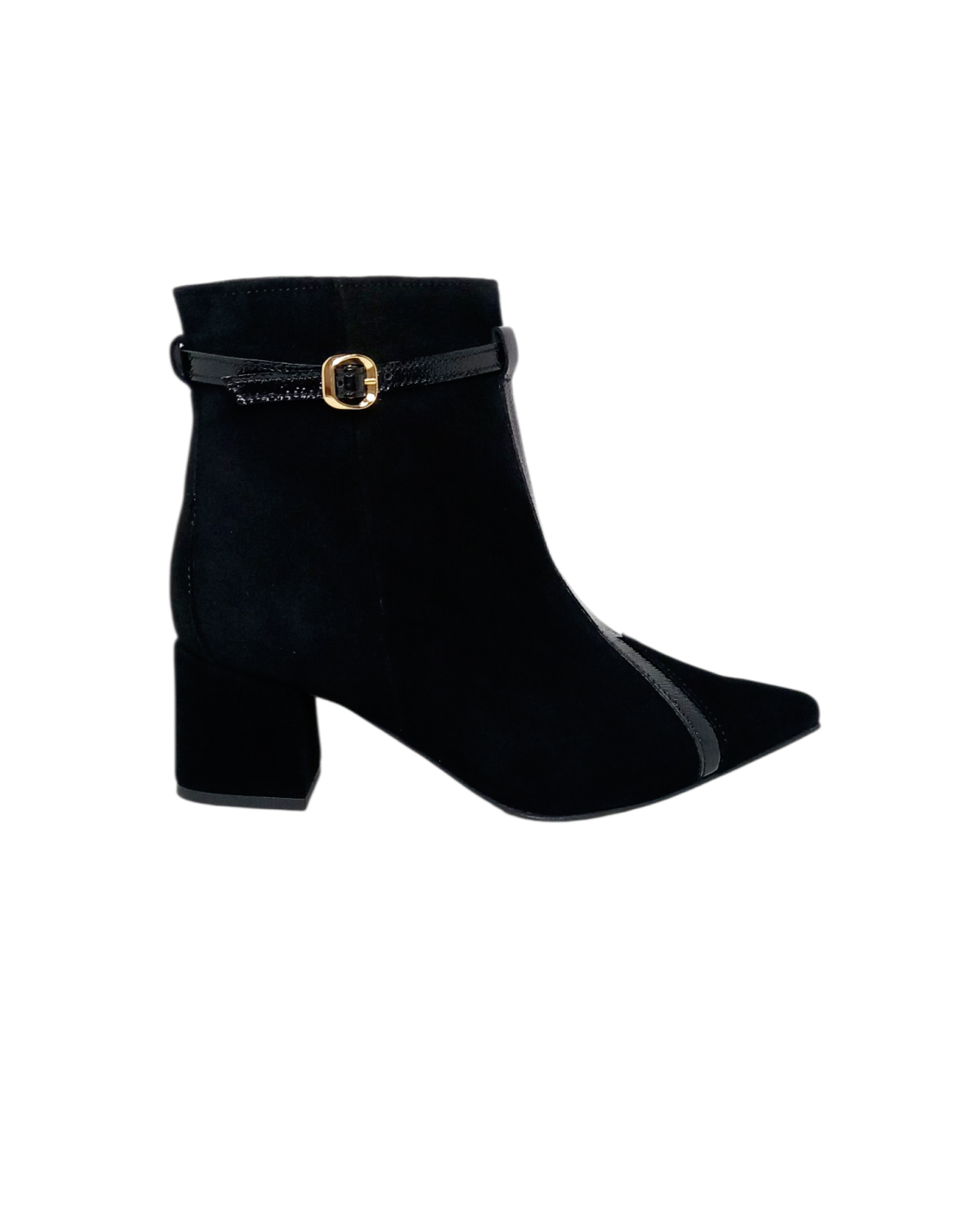 Botín de diseño elegante elaborado en ante piel de color negro, con detalles en charol y adornado con una pulsera fina con hebilla ajustable dorada en la parte superior.
