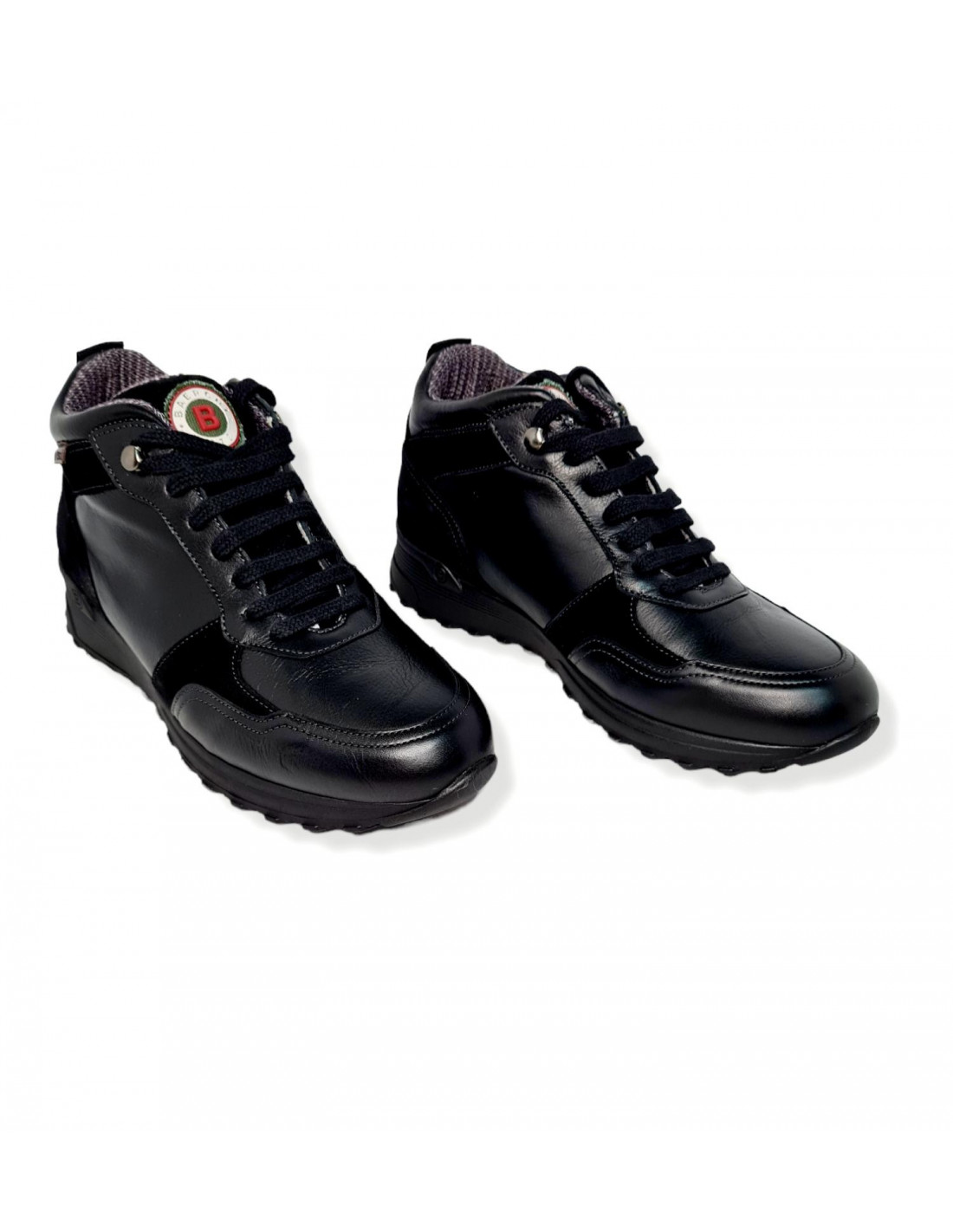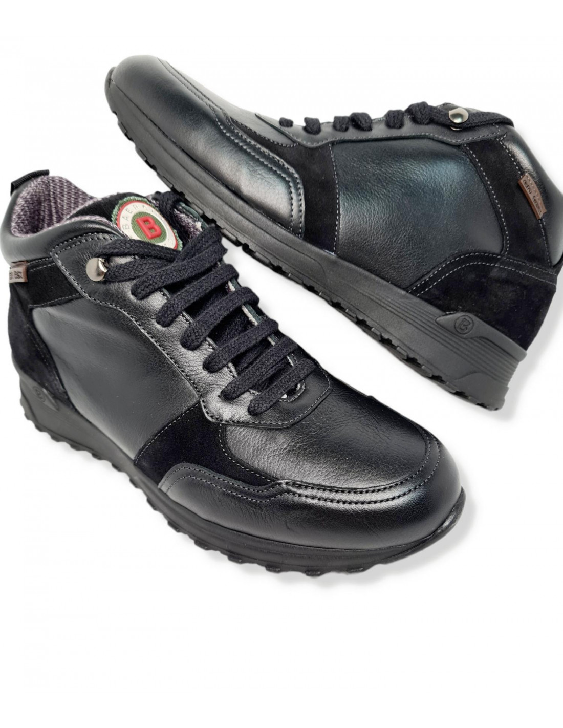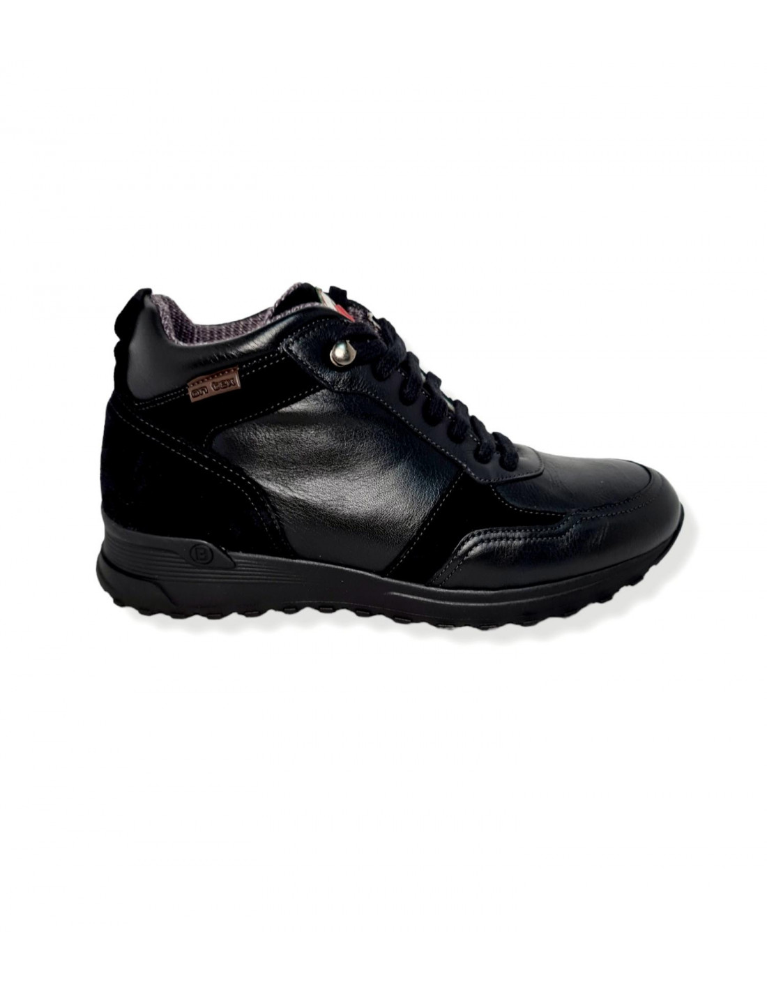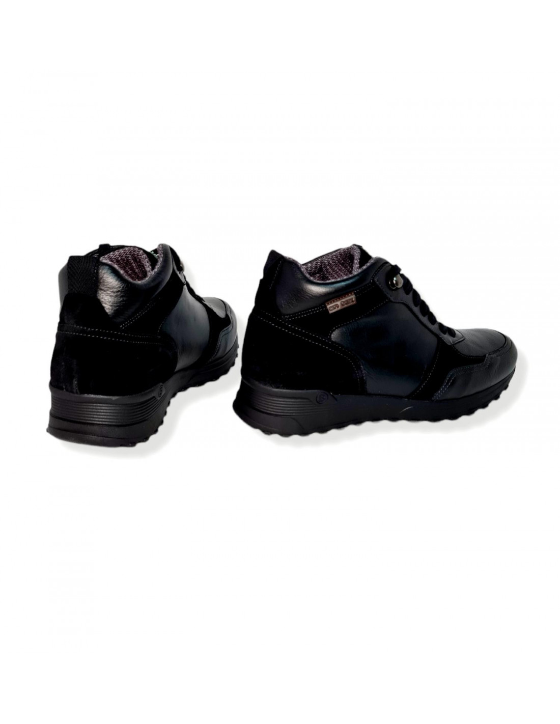 Botín sport medio en piel color negro y serraje, con forro de membrana impermeable, que aísla del frío y la calor. Es un modelo ligero y muy flexible, con un piso preparado para la absorción de impactos, para que el caminar diario sea una delicia. Plantilla extraíble, cuello acolchado para una mayor comodidad y cierre mediante cordones.