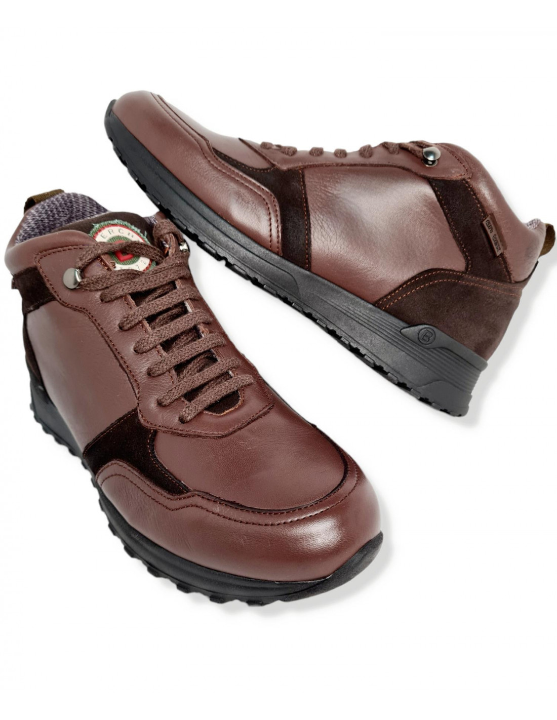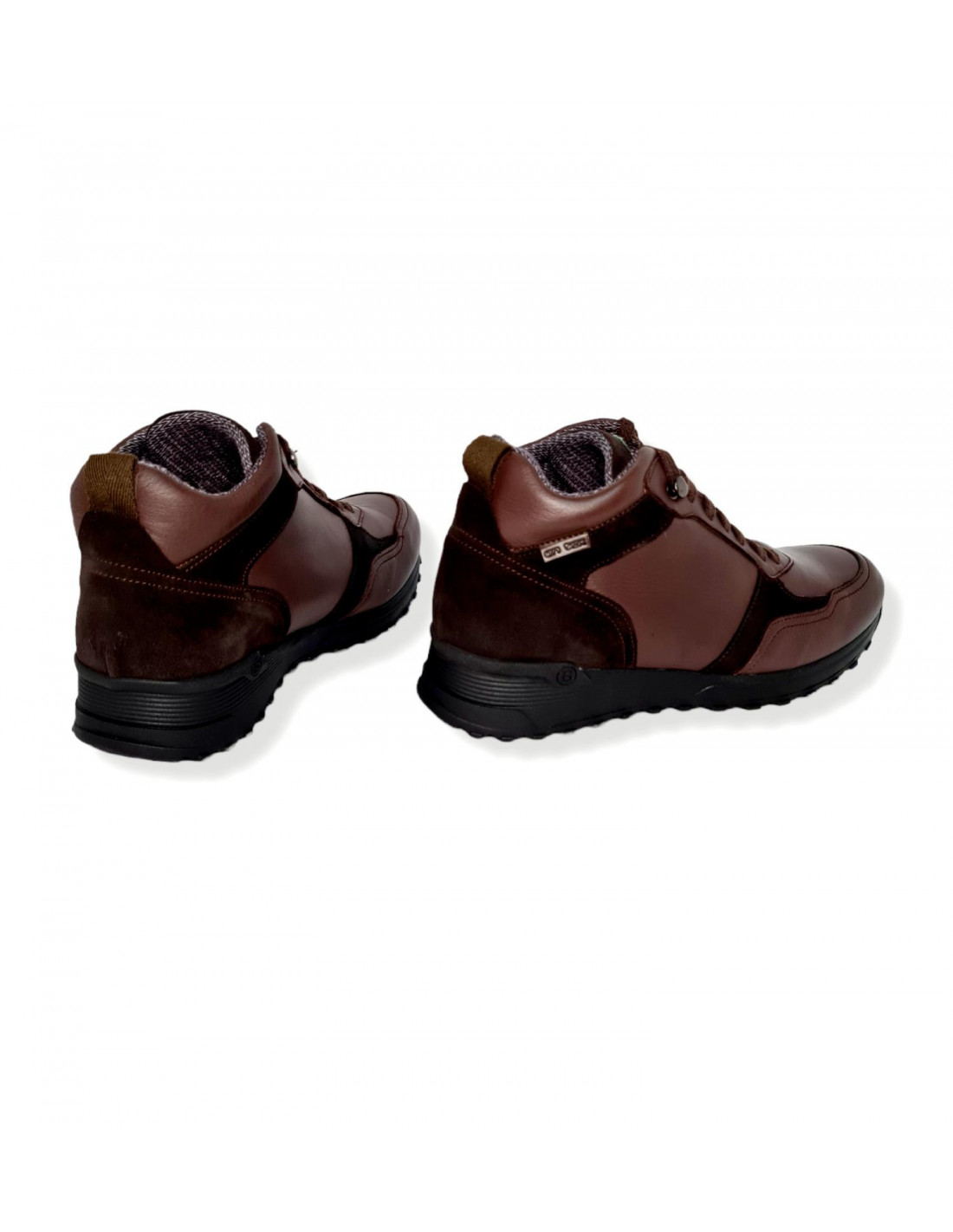 Botín sport medio en piel color marrón y serraje, con forro de membrana impermeable, que aísla del frío y la calor. Es un modelo ligero y muy flexible, con un piso preparado para la absorción de impactos, para que el caminar diario sea una delicia. Plantilla extraíble, cuello acolchado para una mayor comodidad y cierre mediante cordones.