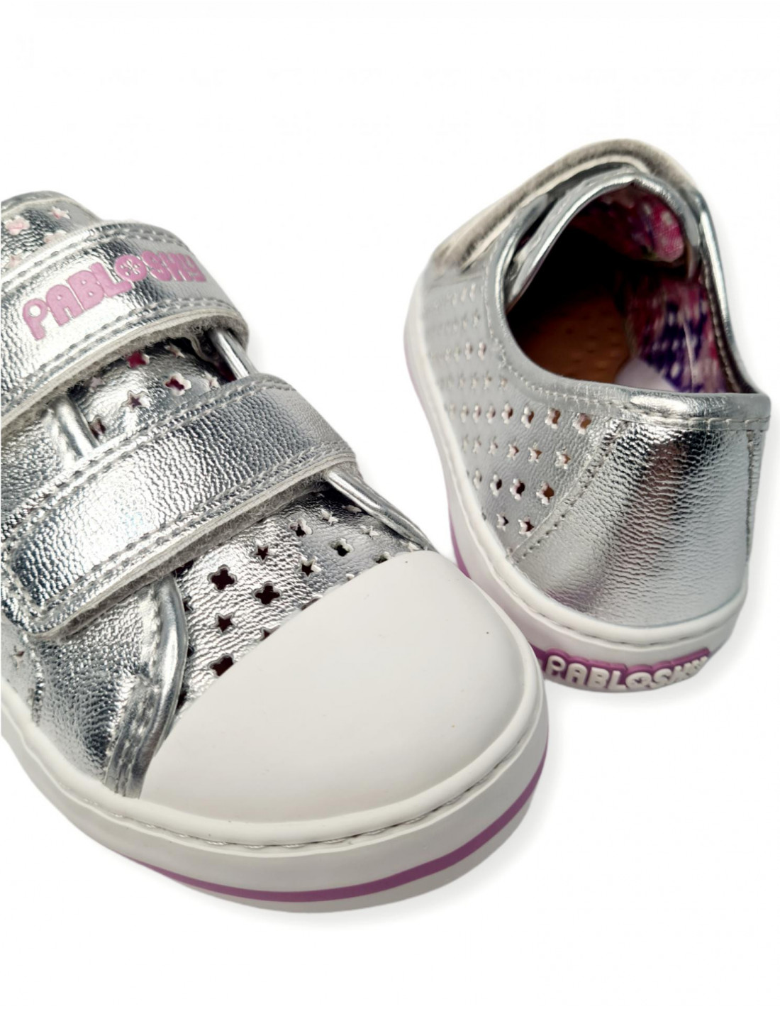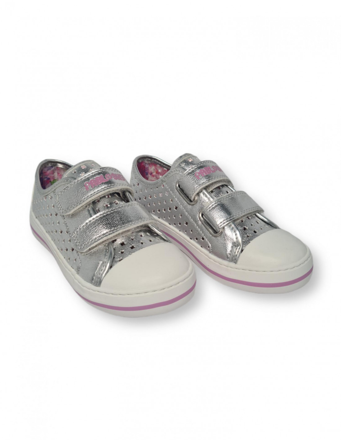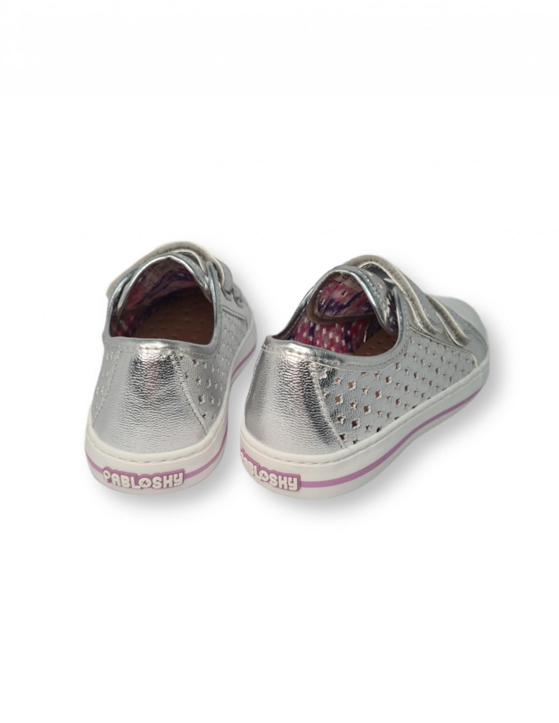 Zapatilla elaborada en lona metalizada en plata, cierre mediante velcro para un perfecto ajuste al pie. Forro interior estampado con plantilla extraíble de piel de primera calidad. Protección de goma en la puntera y piso de goma blanco con franja lila. Suela de goma antideslizante para un buen agarre. Hecho en España.
