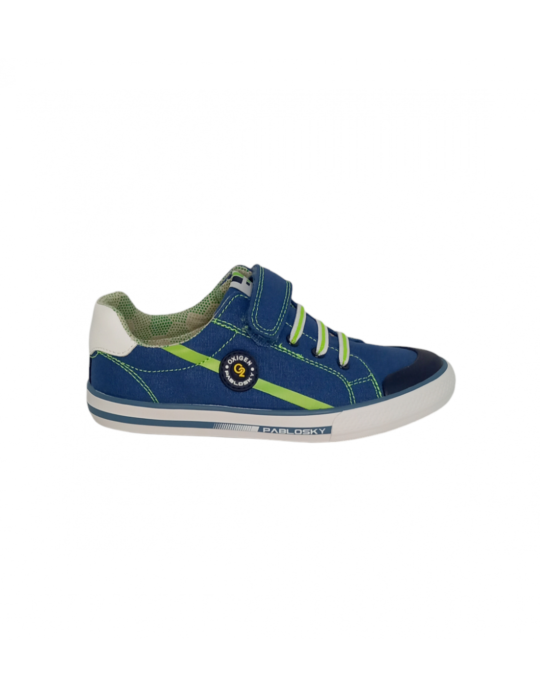 Zapatilla de lona fabricada con material textil de primera calidad que combina varios tonos de azul y detalles en verde.