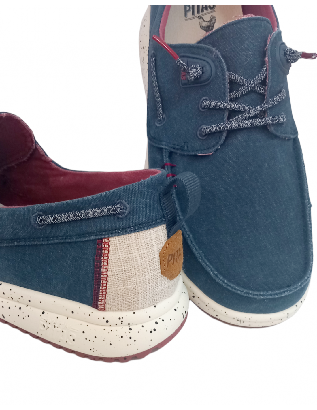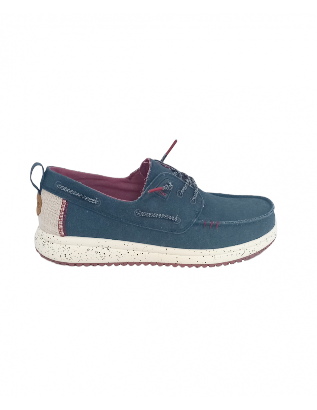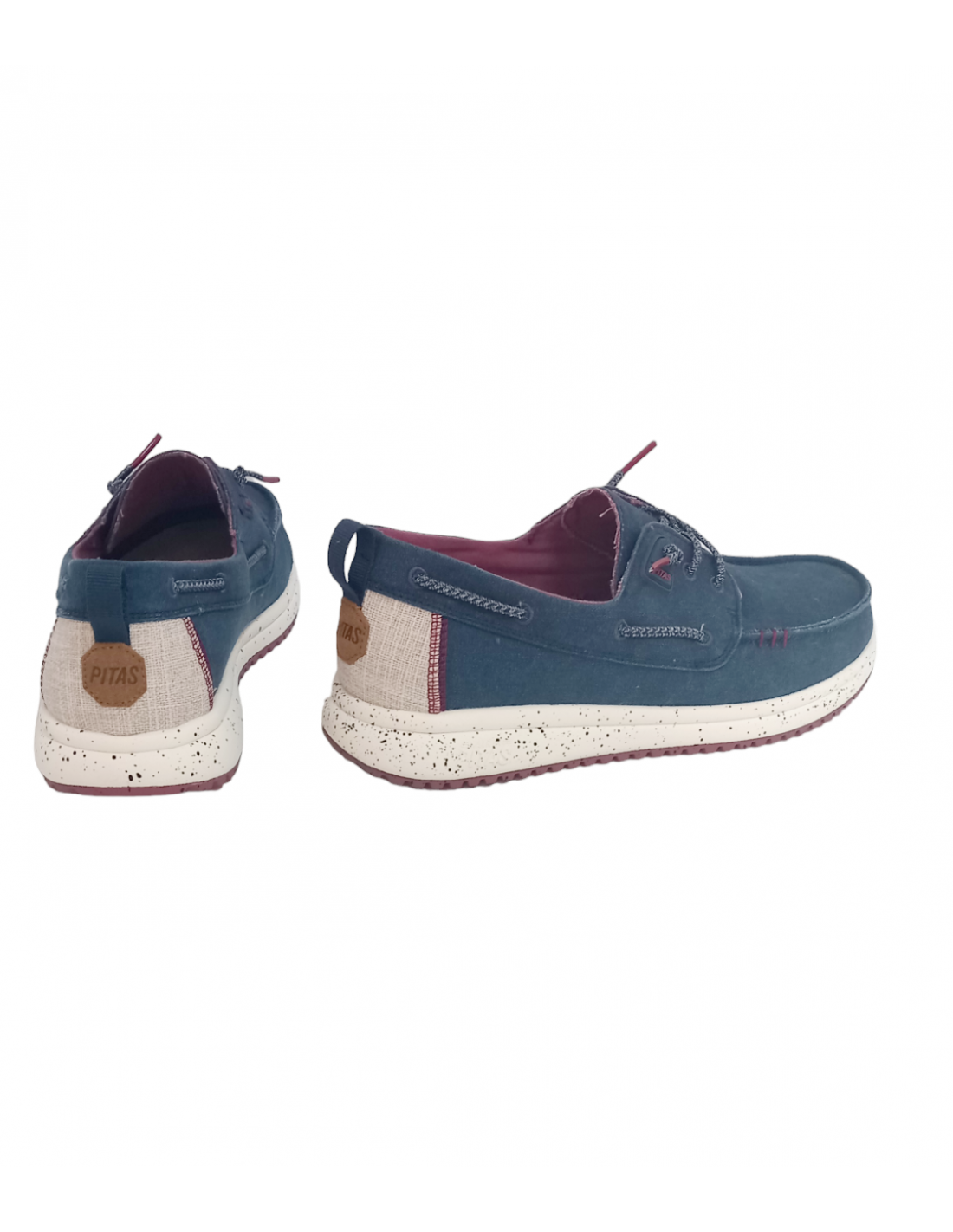 Zapatilla tipo náutico, fabricada en algodón en colores azul marino y marrón con efecto desgastado, talonera de lino y sutiles detalles de color a contraste.