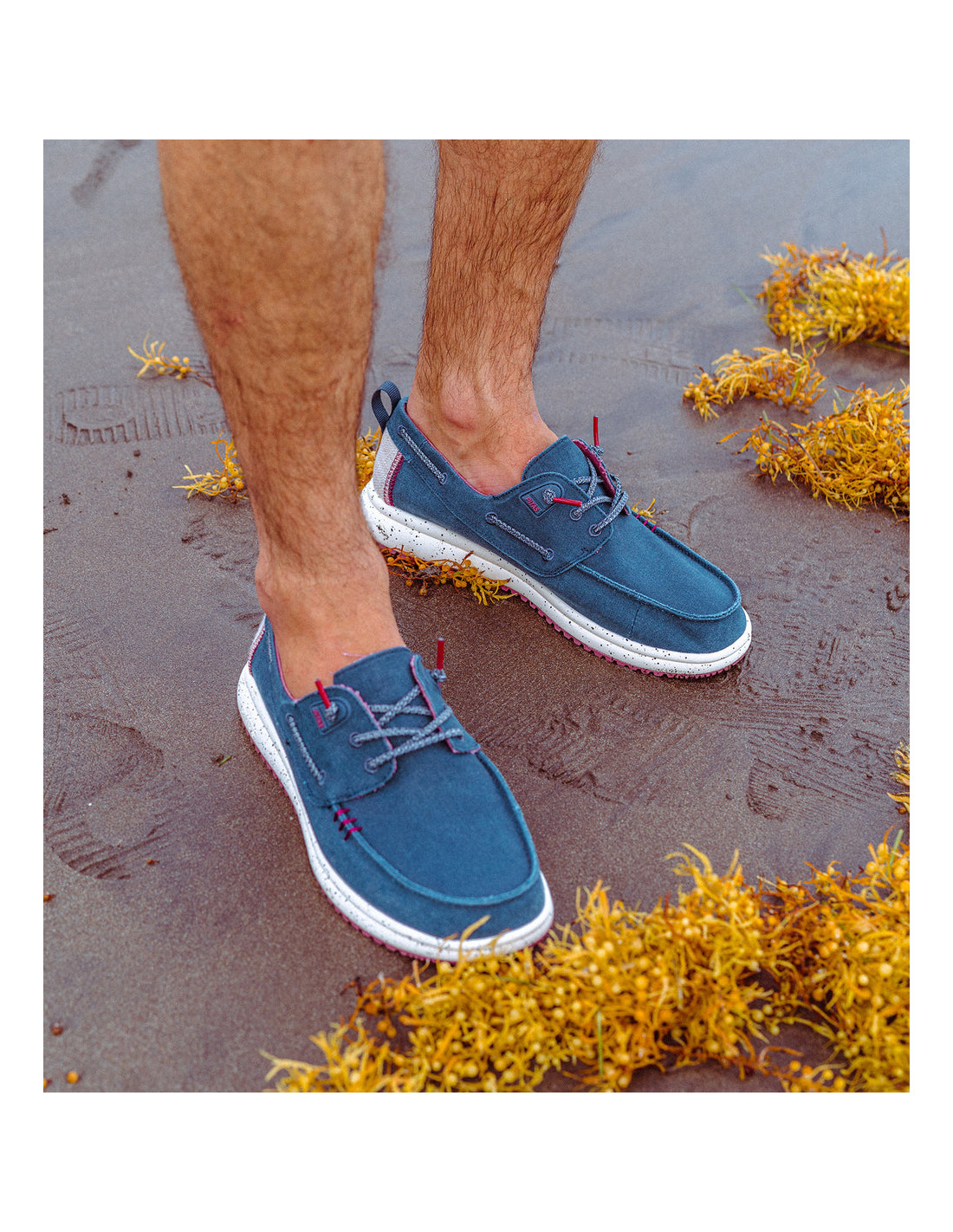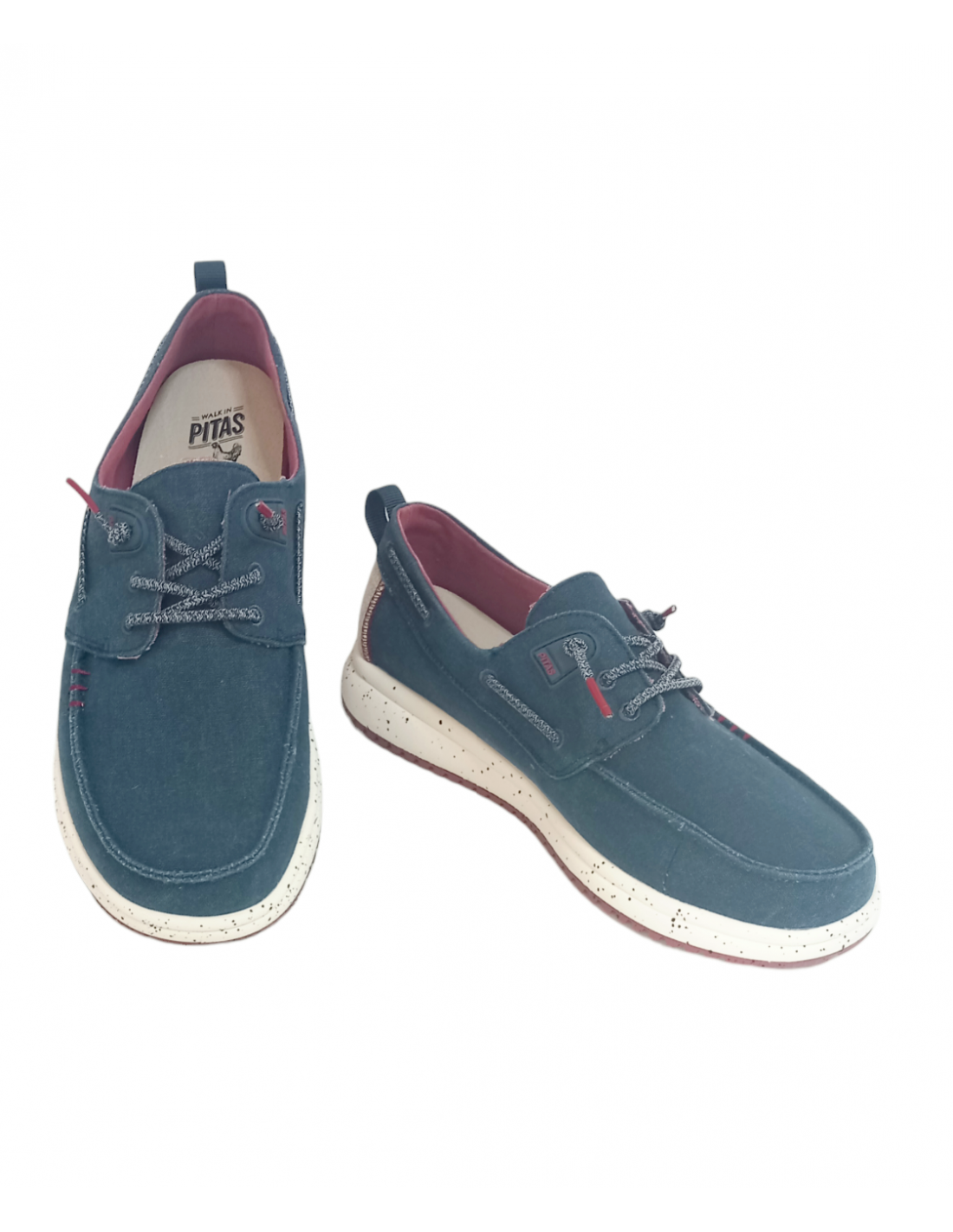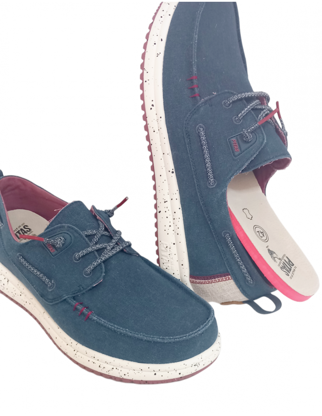 Zapatilla tipo náutico, fabricada en algodón en colores azul marino y marrón con efecto desgastado, talonera de lino y sutiles detalles de color a contraste.