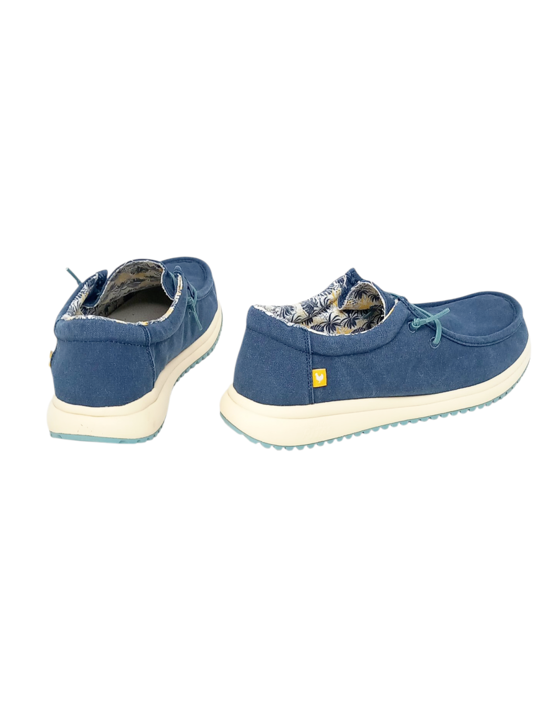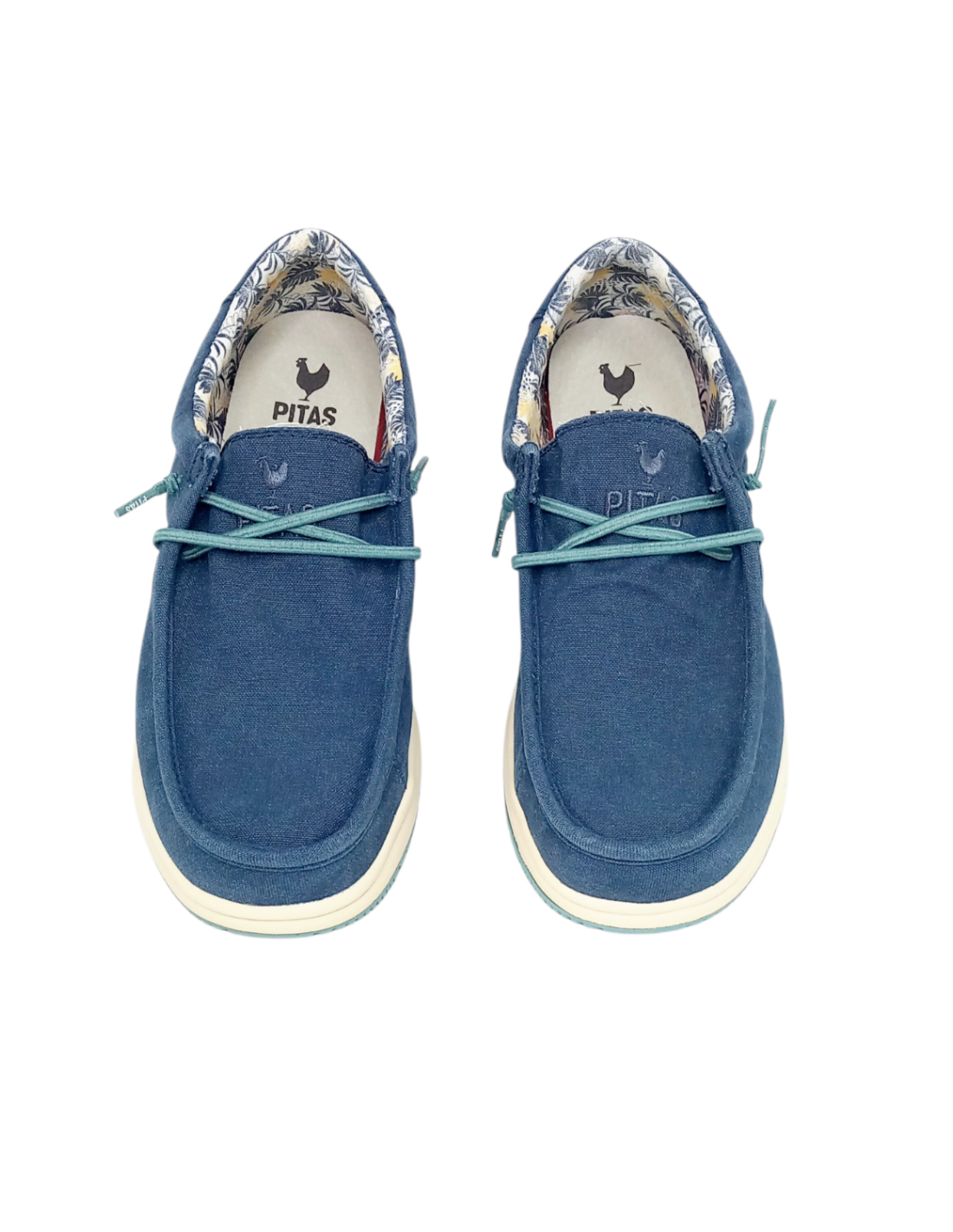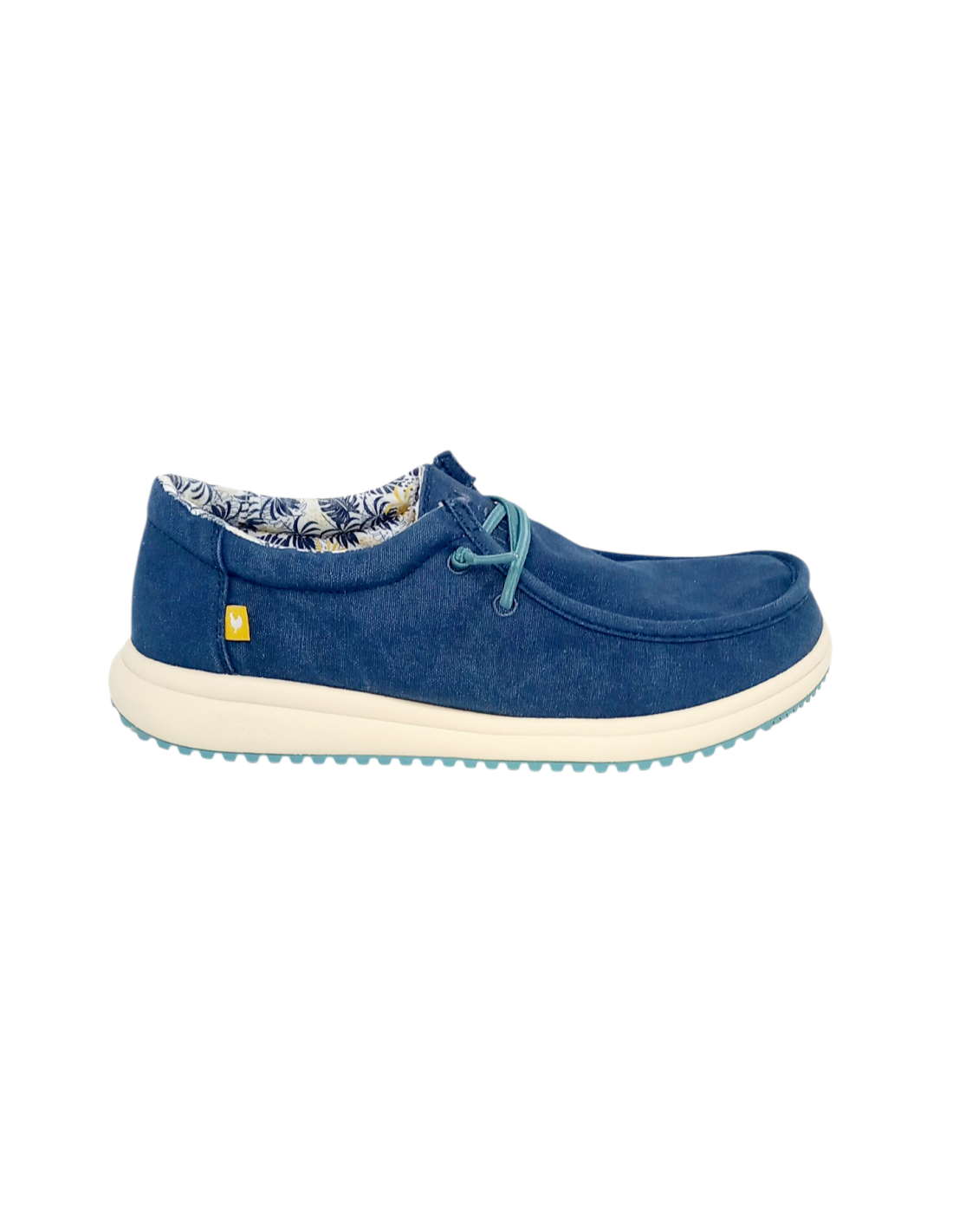 Zapatilla tipo wallabi fabricada con algodón 100% de color azul marino con detalles turquesa.