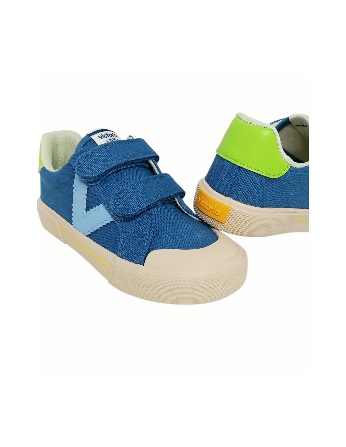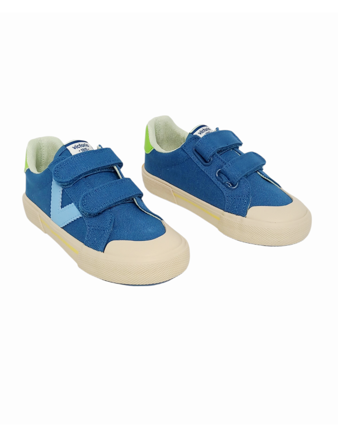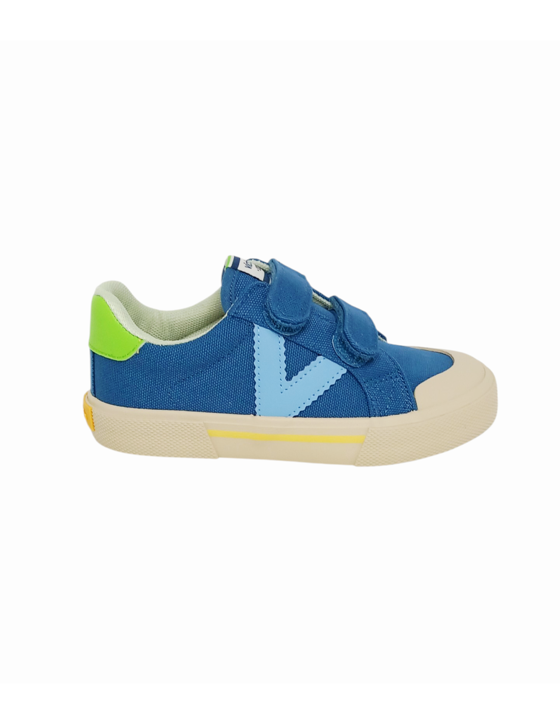 Zapatilla de lona en color azul denim, con el logo característico de la marca V en celeste y talonera en verde.