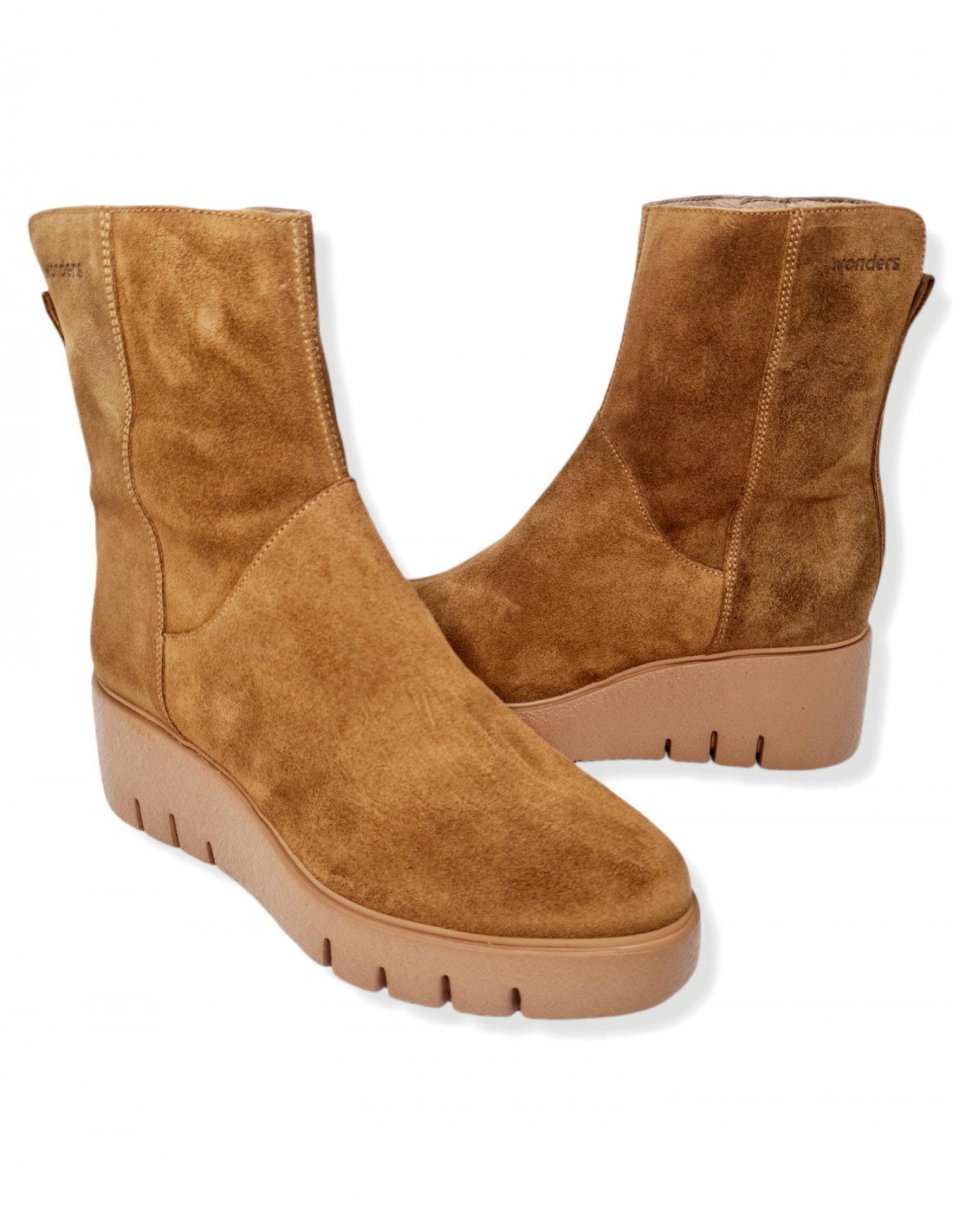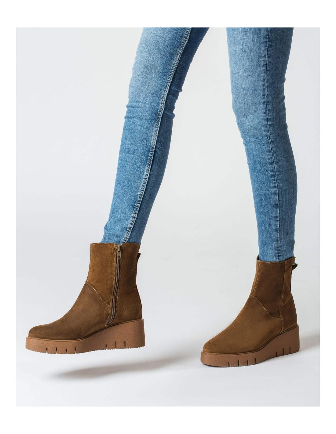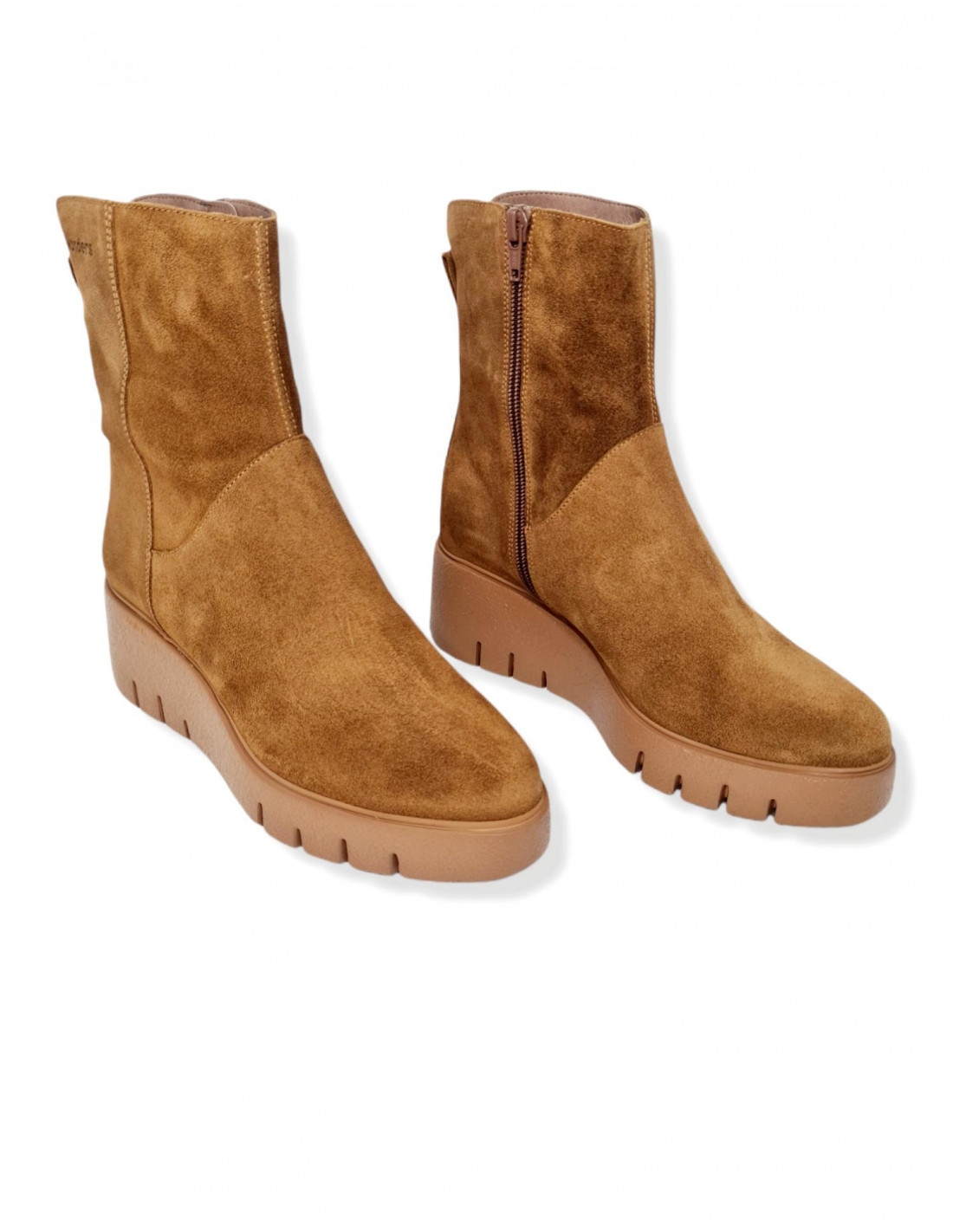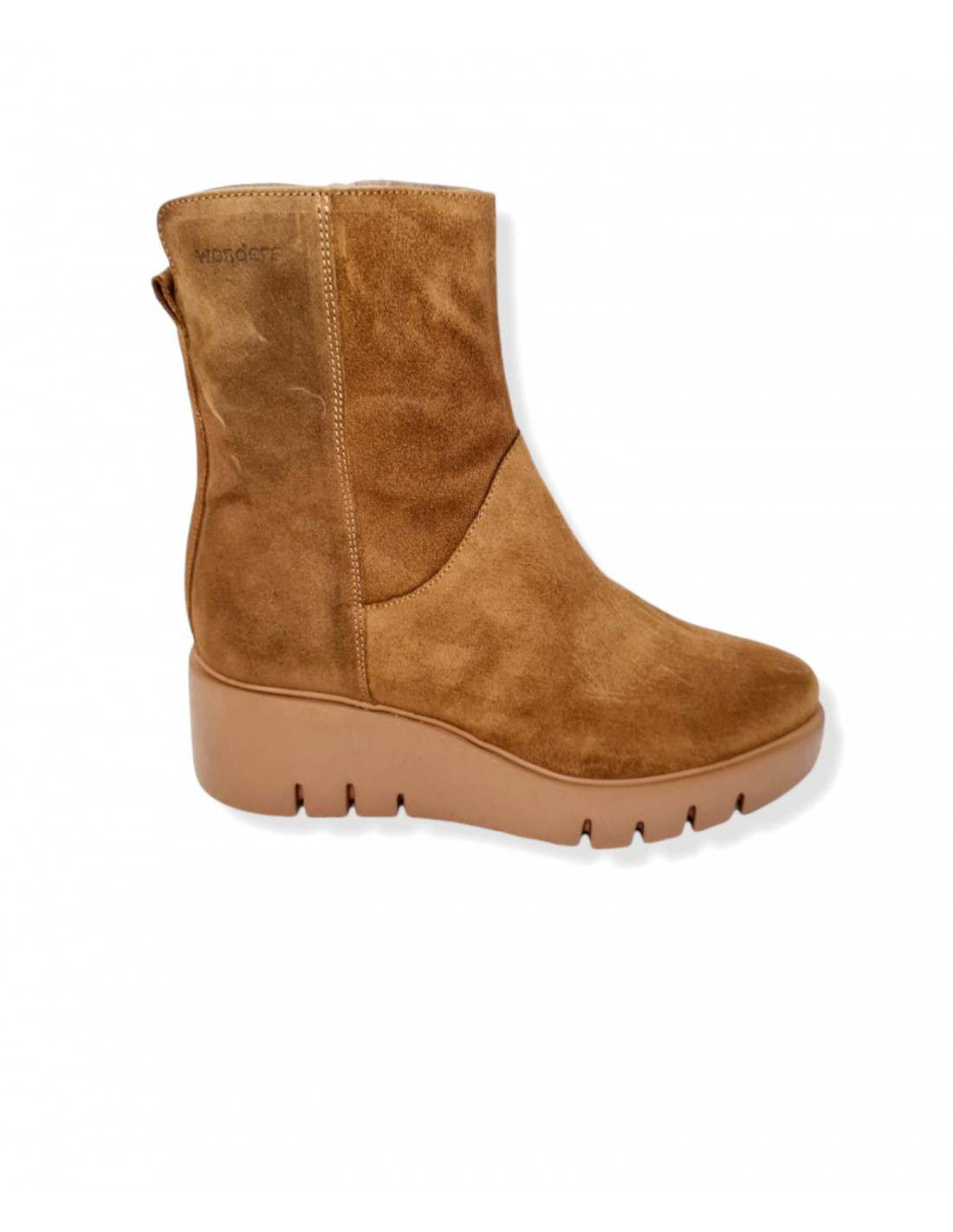 Botín en piel vacuna hidrofugada, color marrón. Cierre con cremallera interior y tira trasera para facilitar el calce. Tiene una suela maxi en cuña, desarrollada con tecnología WondersFly, que garantiza el confort y la ligereza, de 6 cm plataforma trasera, 2,5 plataforma delantera y caña de 17 cm. Forro en piel y plantilla de piel con Memory Gel, para una mayor comodidad al andar.