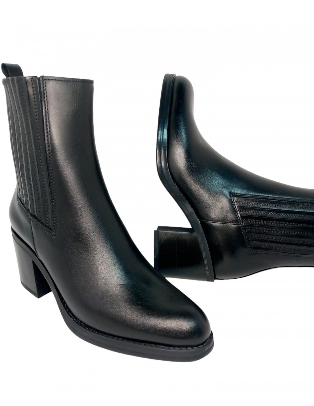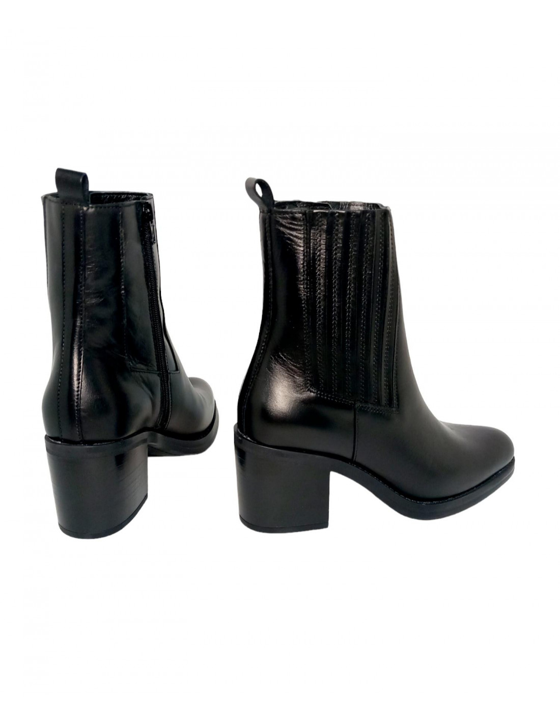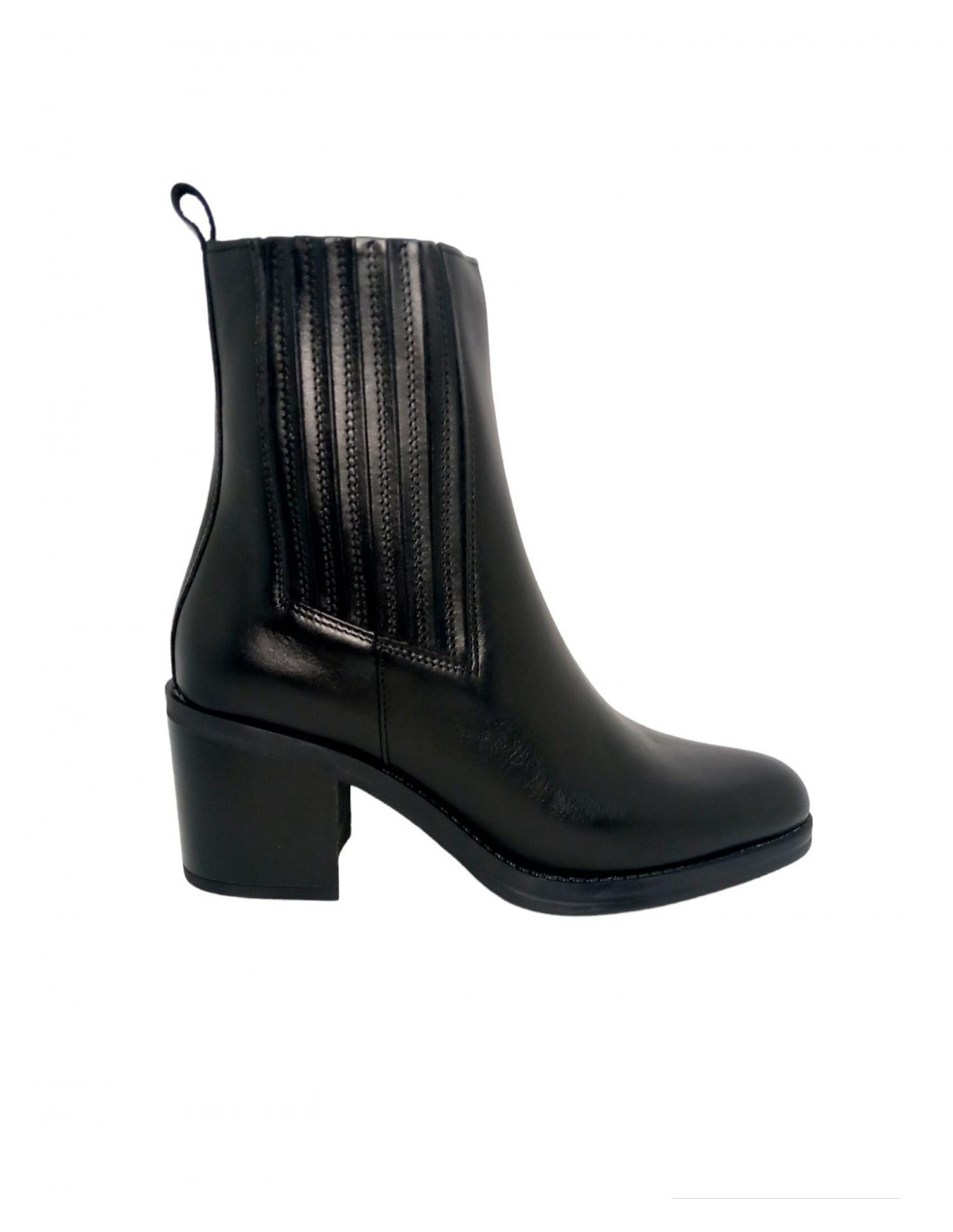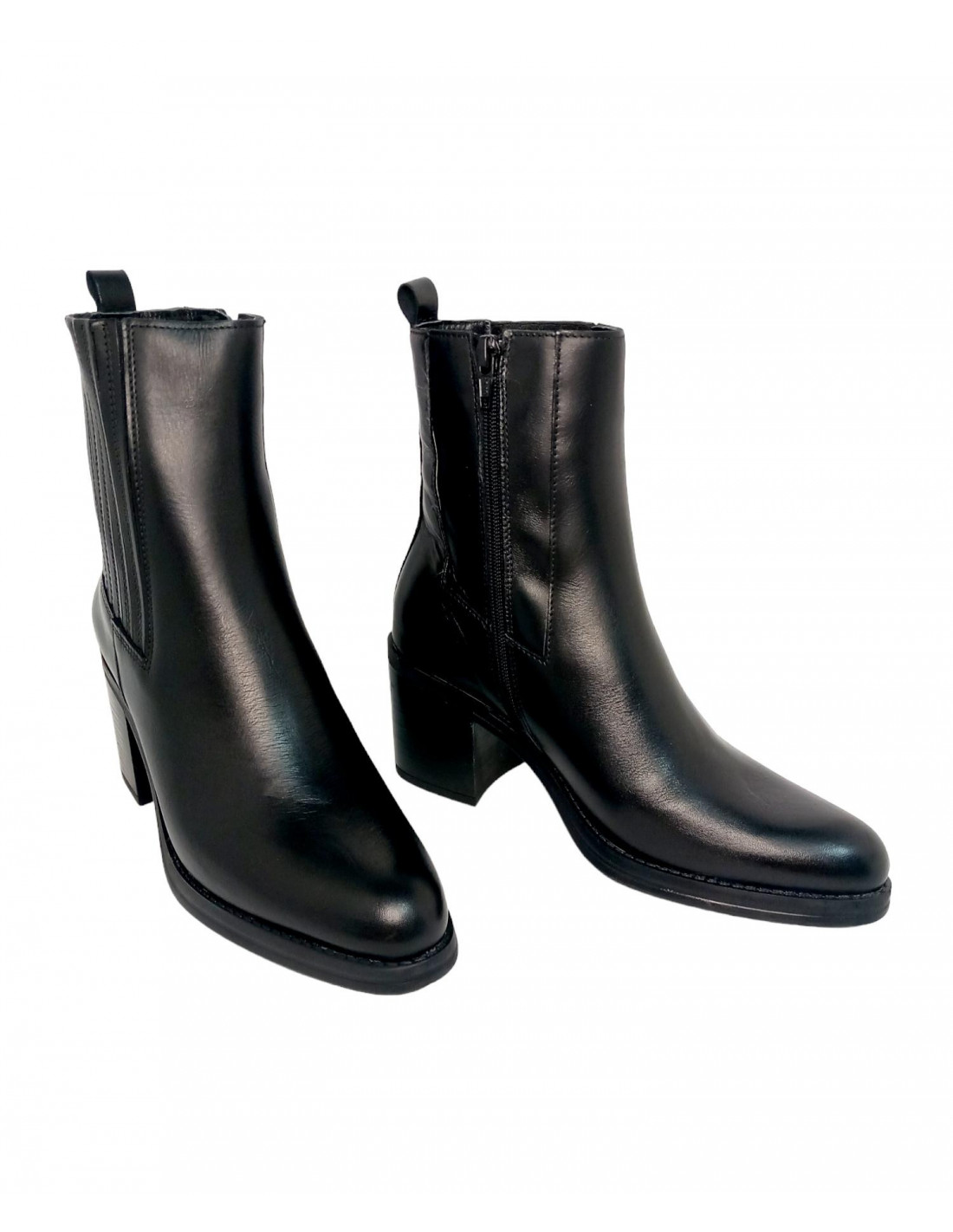 Botín fabricado en piel de primera calidad en color negro. Este modelo viene con un diseño de fuelle en el lateral exterior y cremallera en la parte interna del botín, además cuenta con un tirador en la parte trasera, interior en piel y textil.