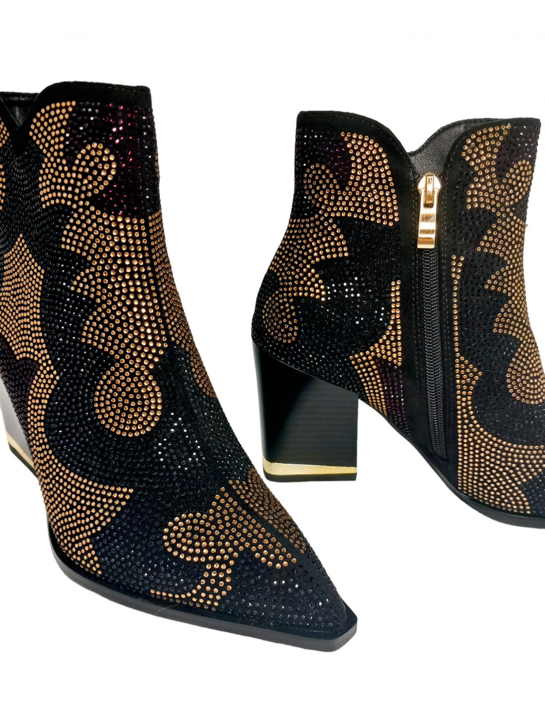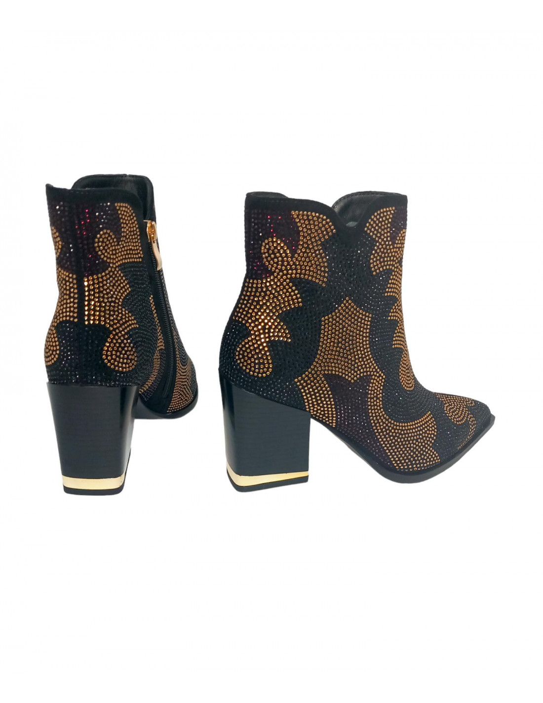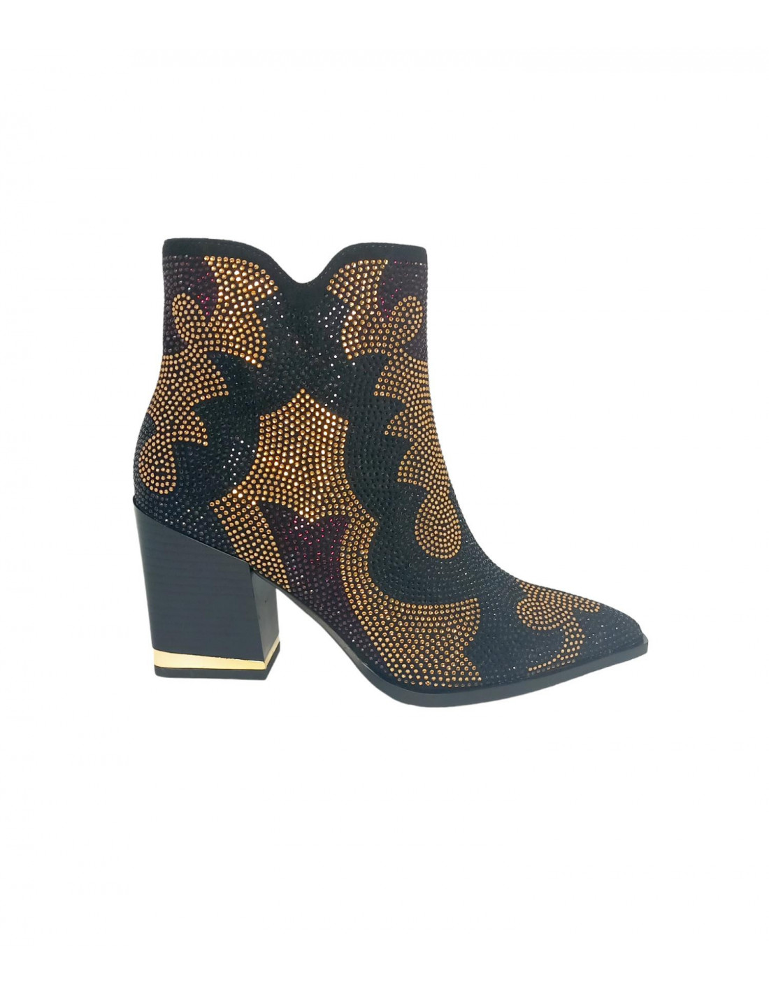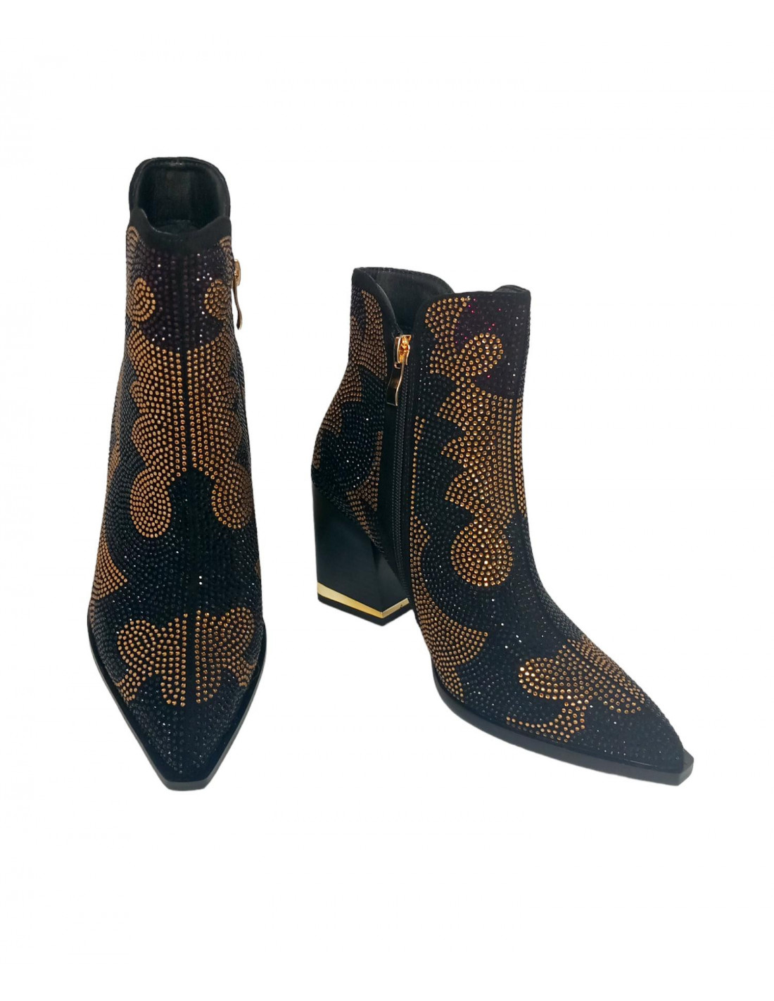 Si quieres brillar aquí tienes tu botín campero, un diseño super original y estiloso con el que arrasarás esta temporada, viene con diseño de dibujos geométricos formado por cristalitos en tonos dorado, negro y en rojo. Cierre mediante cremallera en la parte interior, con forro en textil aterciopelado y plantilla acolchada para una mayor comodidad. Suela de goma con tacón de 8,5 cm de altura con un toque en dorado en la parte inferior.