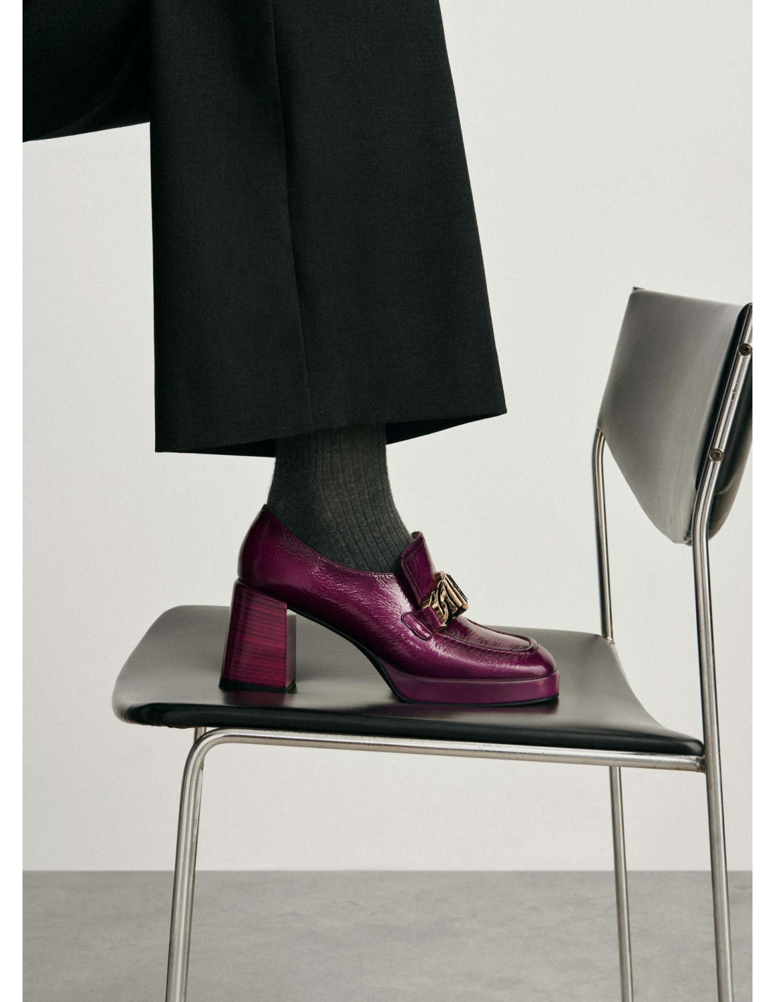 Mocasín con copete en piel vacuno color magenta, con punta redonda y adorno en el empeine en color dorado con isotipo doble "H" . Diseño de tacón en bloque ancho de una altura de 7,5 cm. y plataforma delantera de 2 cm. Forro interior en microfibra con plantilla en acolchada para una máxima comodidad con suela de Poliuretano.