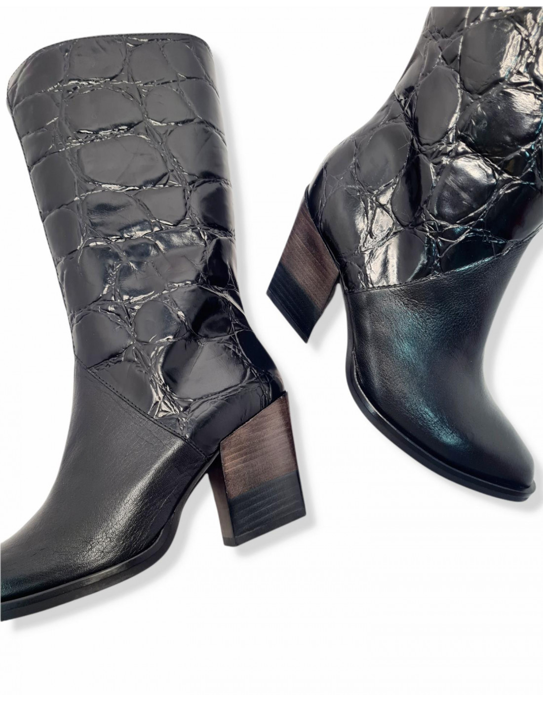 Bota 100% piel vacuno en color negro, con un diseño cowboy de costuras al tono y animal print, de punta afilada, tacón geométrico y cierre mediante cremallera interior, solo en la parte inferior de la bota. Piso flexible y resistente con extra de comodidad, que aporta un toque sofisticado a su estilo campero.