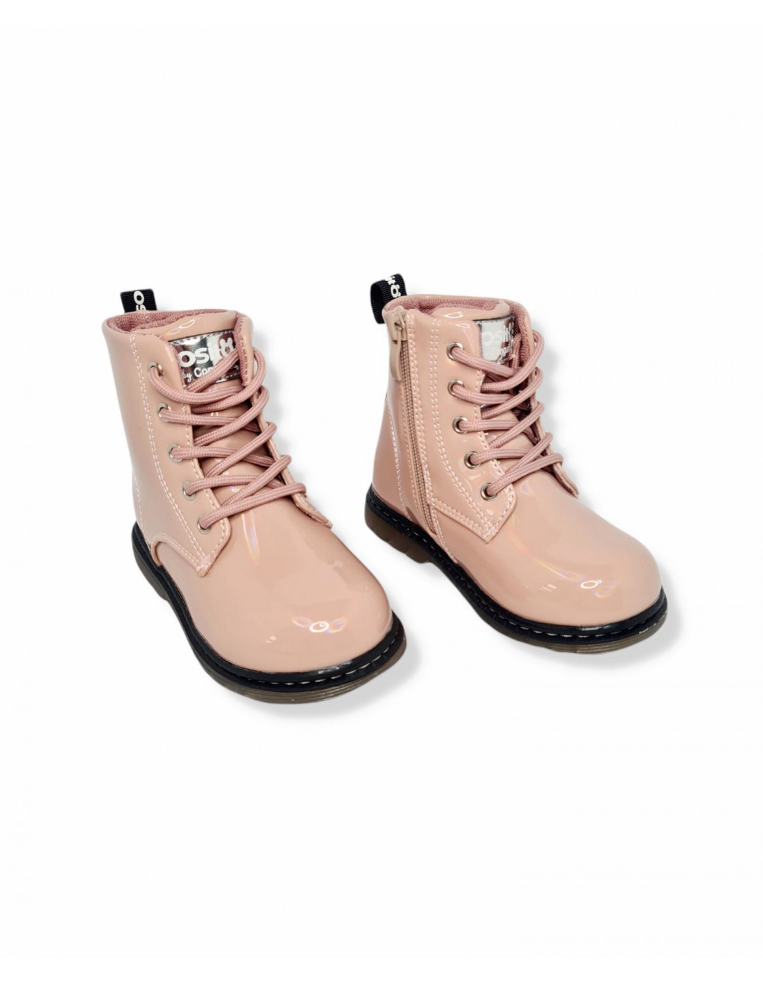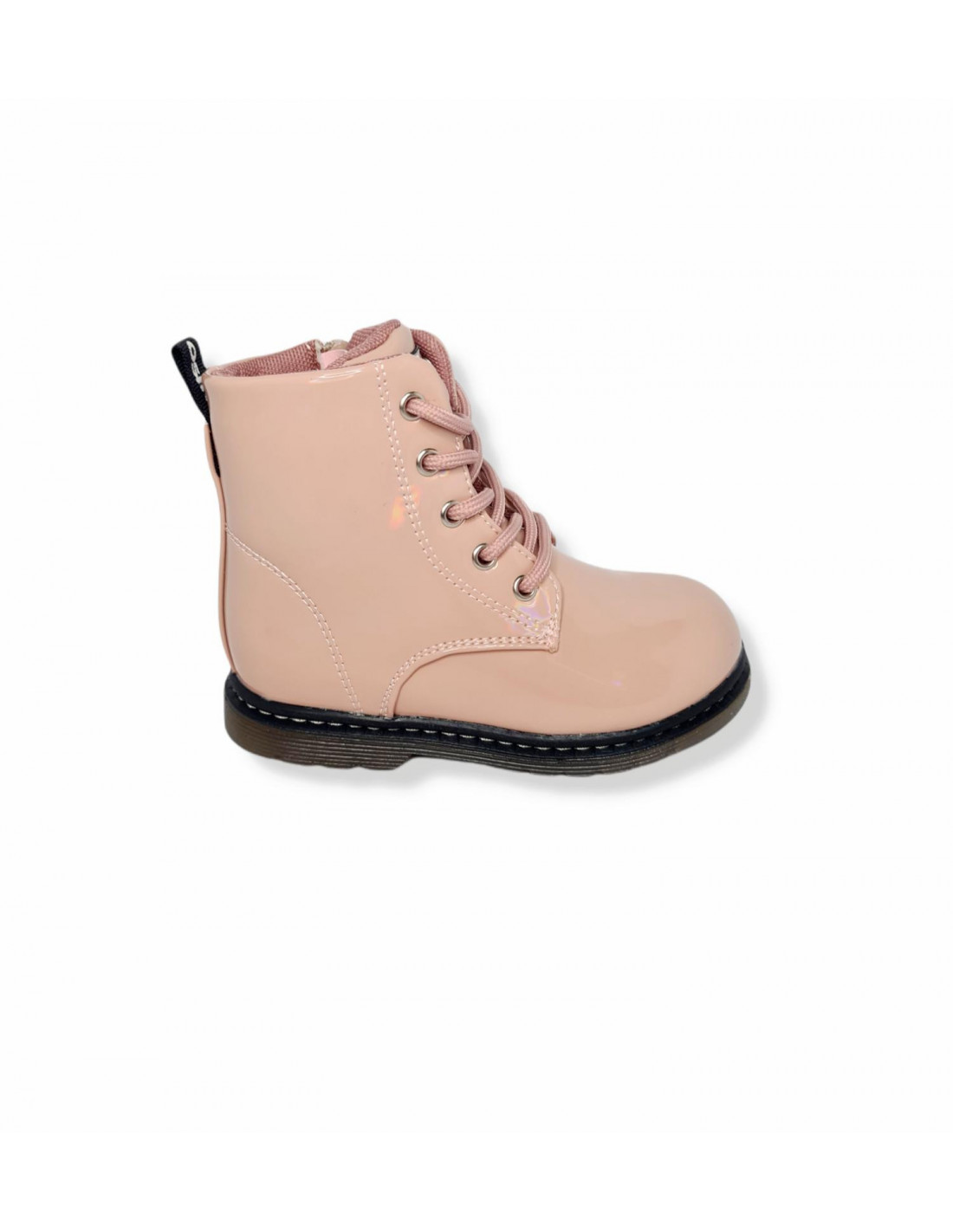 Botín estilo militar, en charol rosa con acabado irisado, con cierre mediante cordón y cremallera interior, para una buena sujeción del pie. Forro y plantilla en textil, con suela de goma.