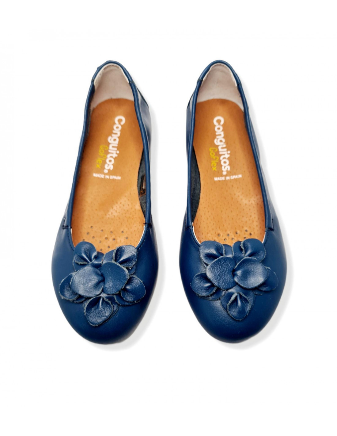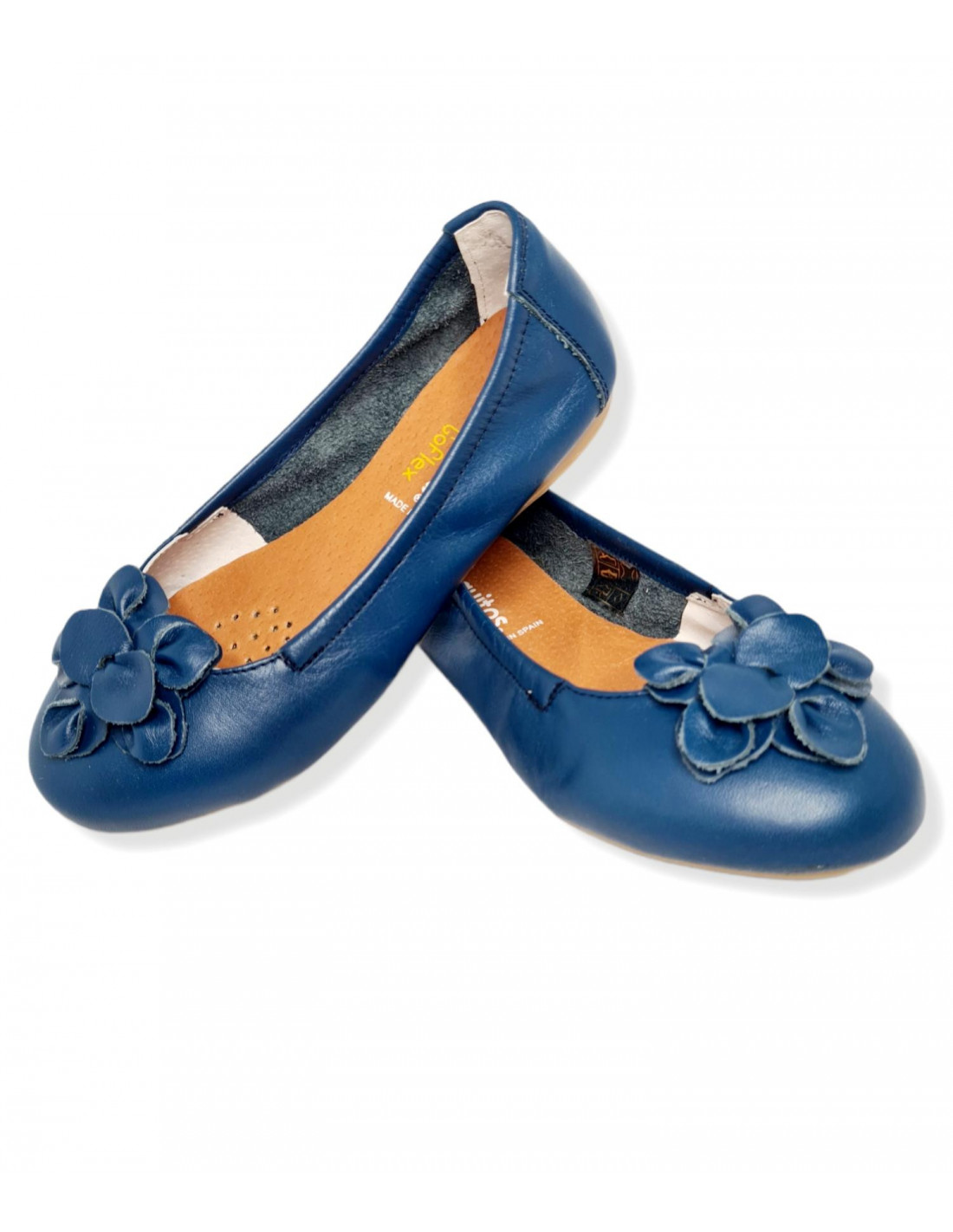 Bailarina fabricada en piel de primera calidad en color azul, con detalle de flor en la parte delantera. Plantilla de piel y elástico en los laterales para un buen agarre al pie.