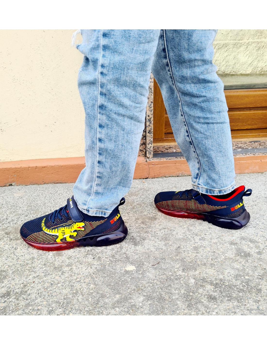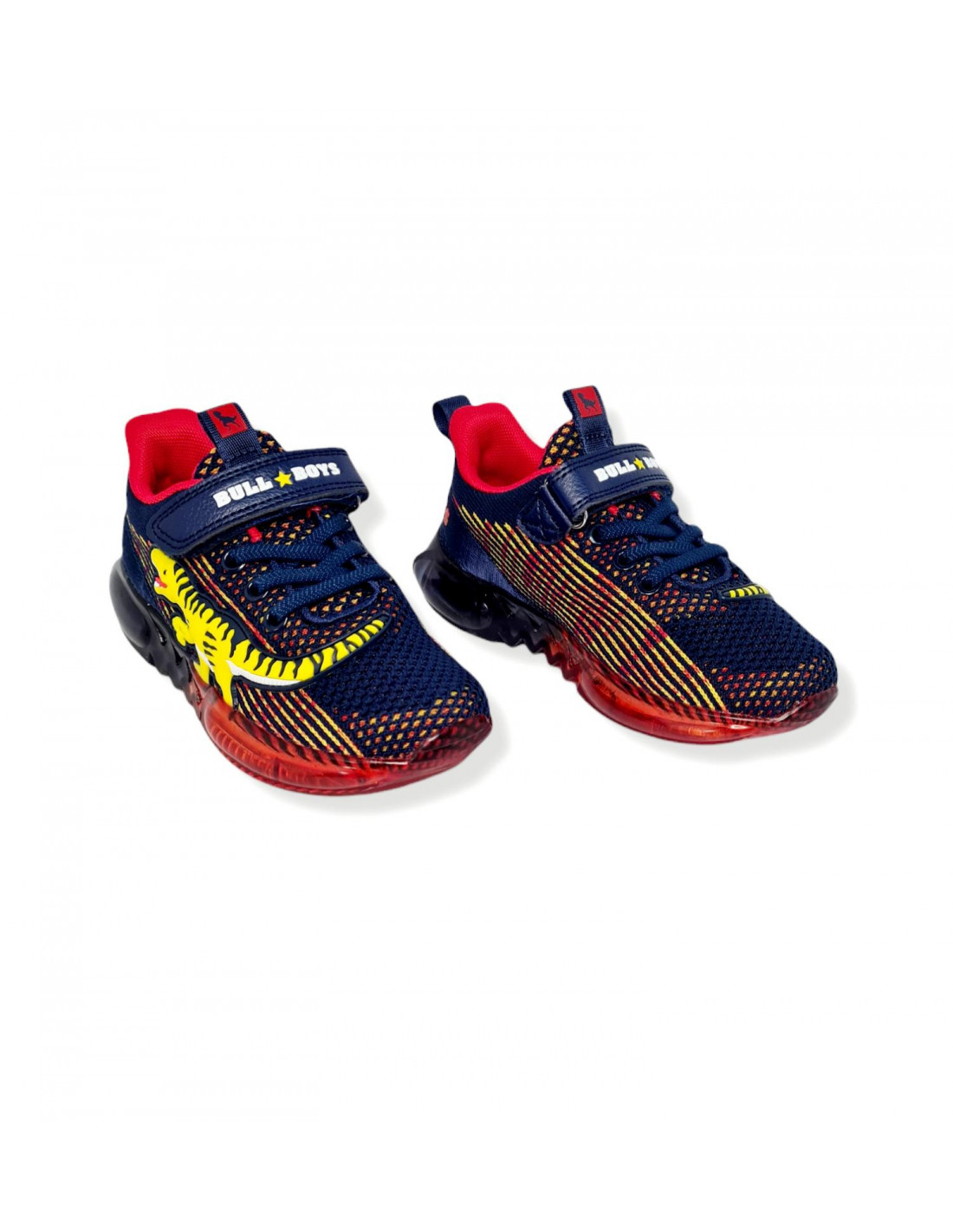 Deportivo de nylon en color azul marino combinado con rojo, además del detalle de un dinosaurio amarillo en el lateral. Cuenta con LUCES en la suela que se activan con la pisada.