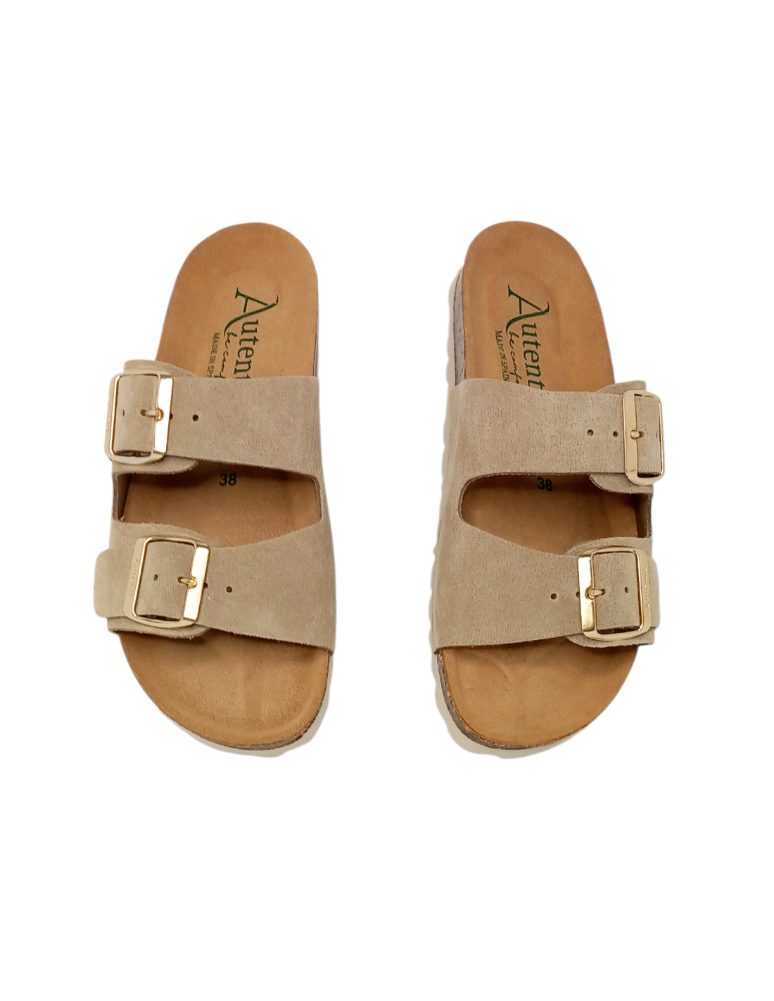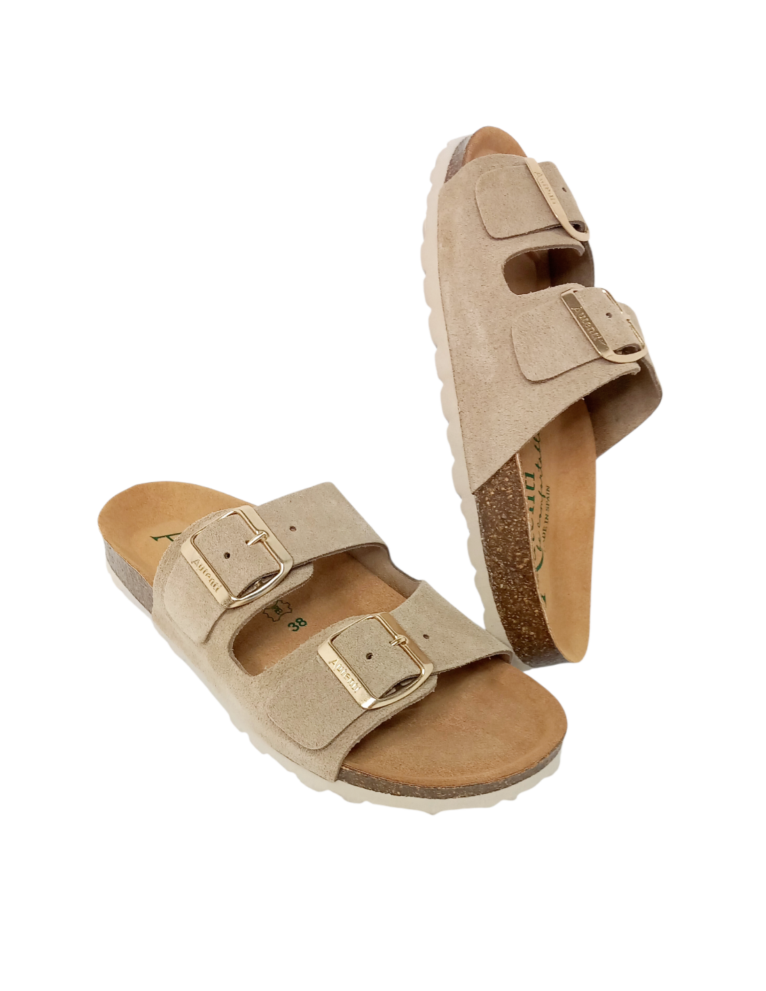 Sandalia bio fabricada en piel serraje en color topo, estilo pala, con dos tiras en el empeine con cierre mediante hebillas ajustables en color dorado, para adaptarlas a la perfección a cualquier tipo de pie, dándole además un toque moderno y estiloso.