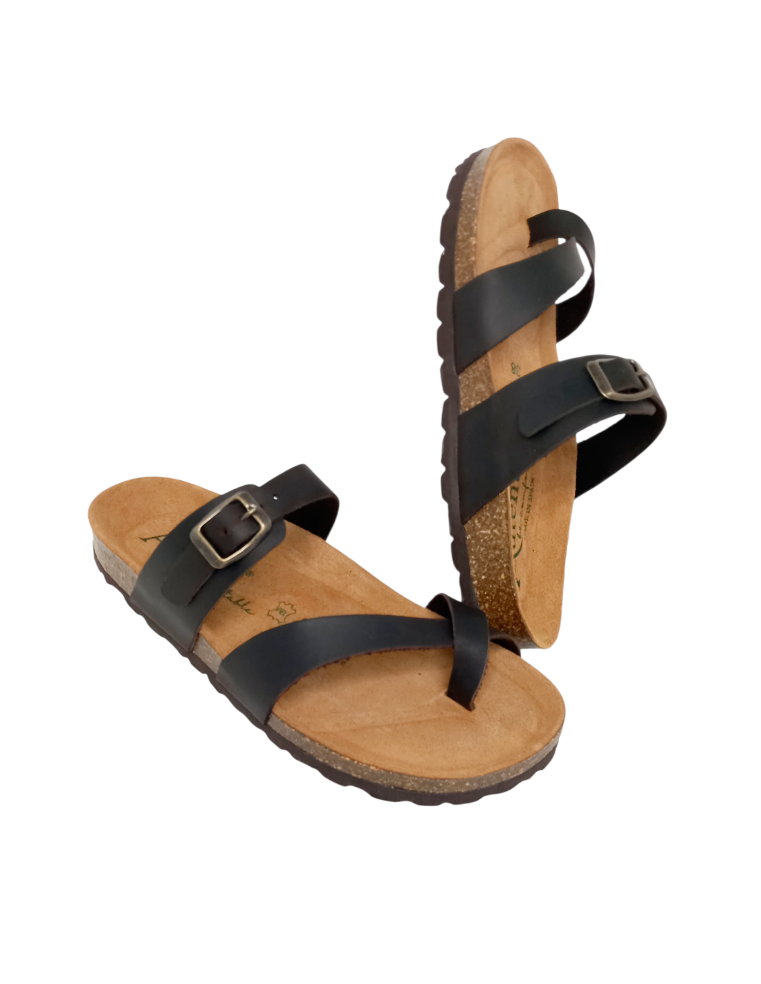 Sandalia bio de dedo fabricada en piel engrasada de color marrón chocolate, con dos tiras para sujetar el dedo gordo del pie además de una en la zona del empeine con cierre de hebilla ajustable, para adaptarla a la perfección a cualquier tipo de pie.