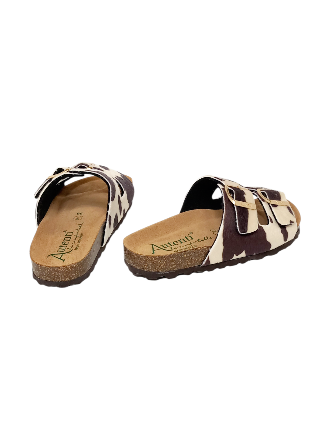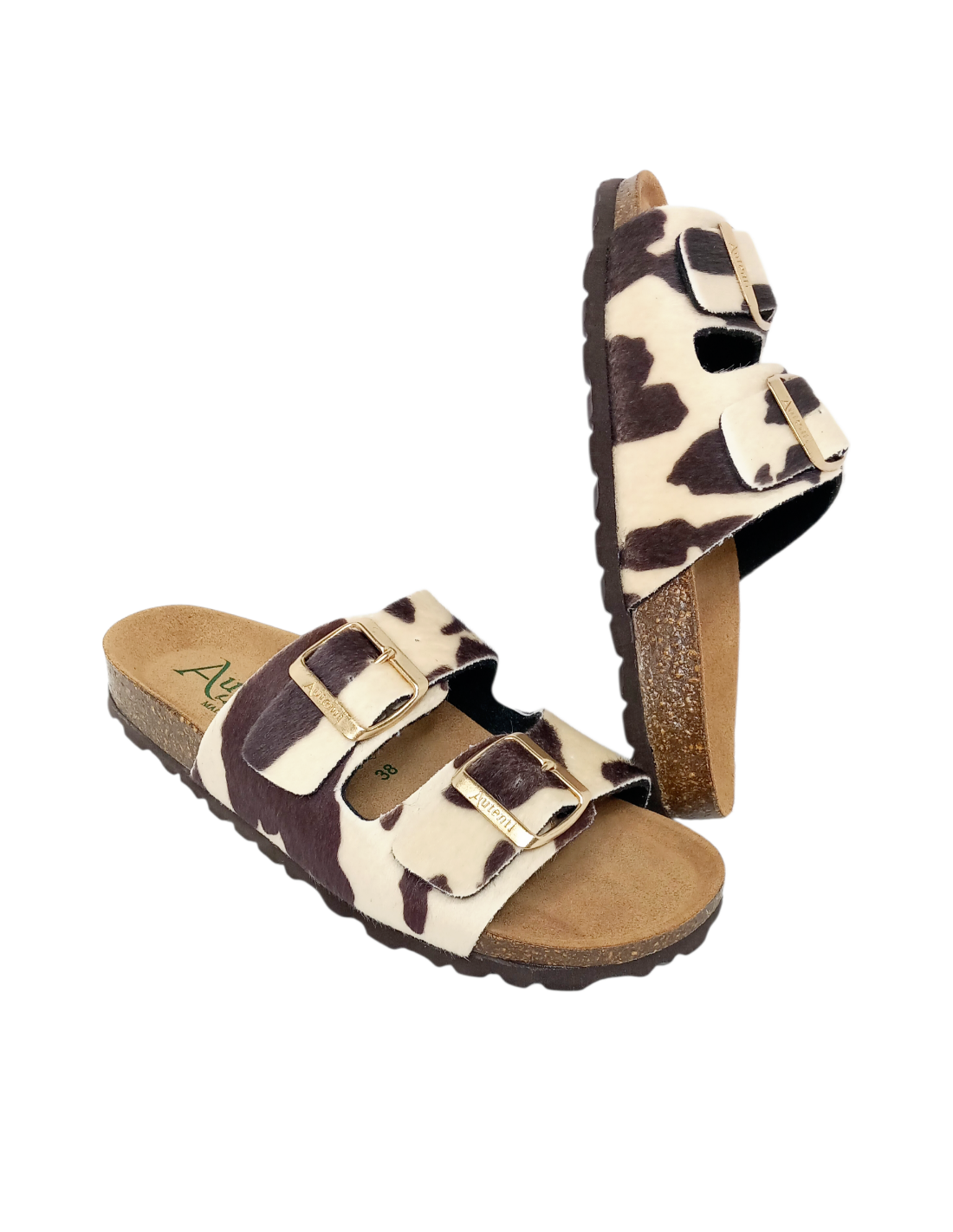 Sandalia bio fabricado en un acabado tipo pelo de potro en animal print de vaca en colores marrón y beige, estilo pala, con dos tiras en el empeine con cierre mediante hebillas ajustables en color dorado, para adaptarlas a la perfección a cualquier tipo de pie, dándole además un toque moderno y estiloso.