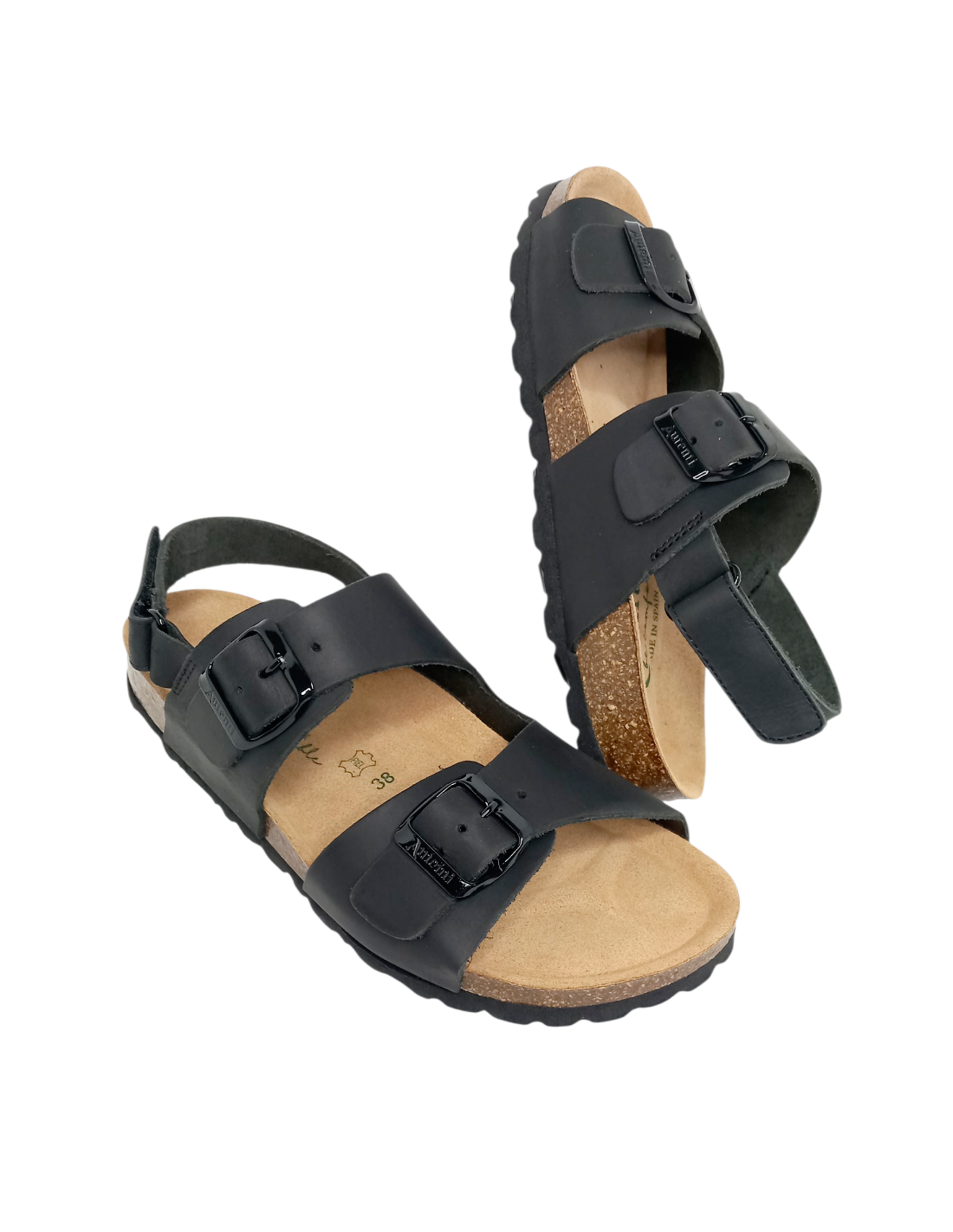 Sandalia bio para mujer fabricada en cuero natural color negro.