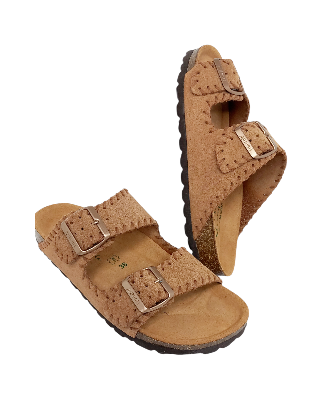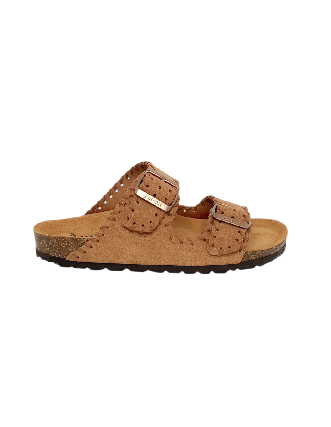 Sandalia bio para mujer con diseño de cosidos en color cuero, estilo pala, con dos tiras en el empeine con cierre mediante hebillas ajustables en color dorado, para adaptarlas a la perfección a cualquier tipo de pie, dándole además un toque moderno y estiloso.