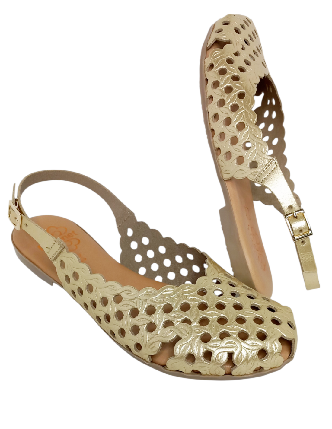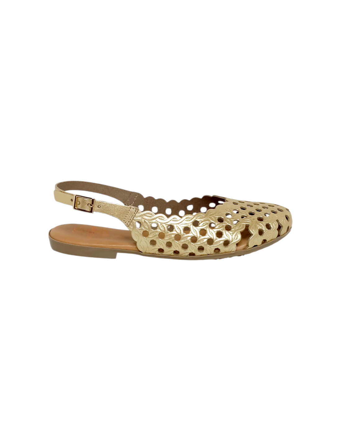 Sandalia plana cerrada por delante, destalonada y fabricada en piel troquelada en colores oro y marrón.