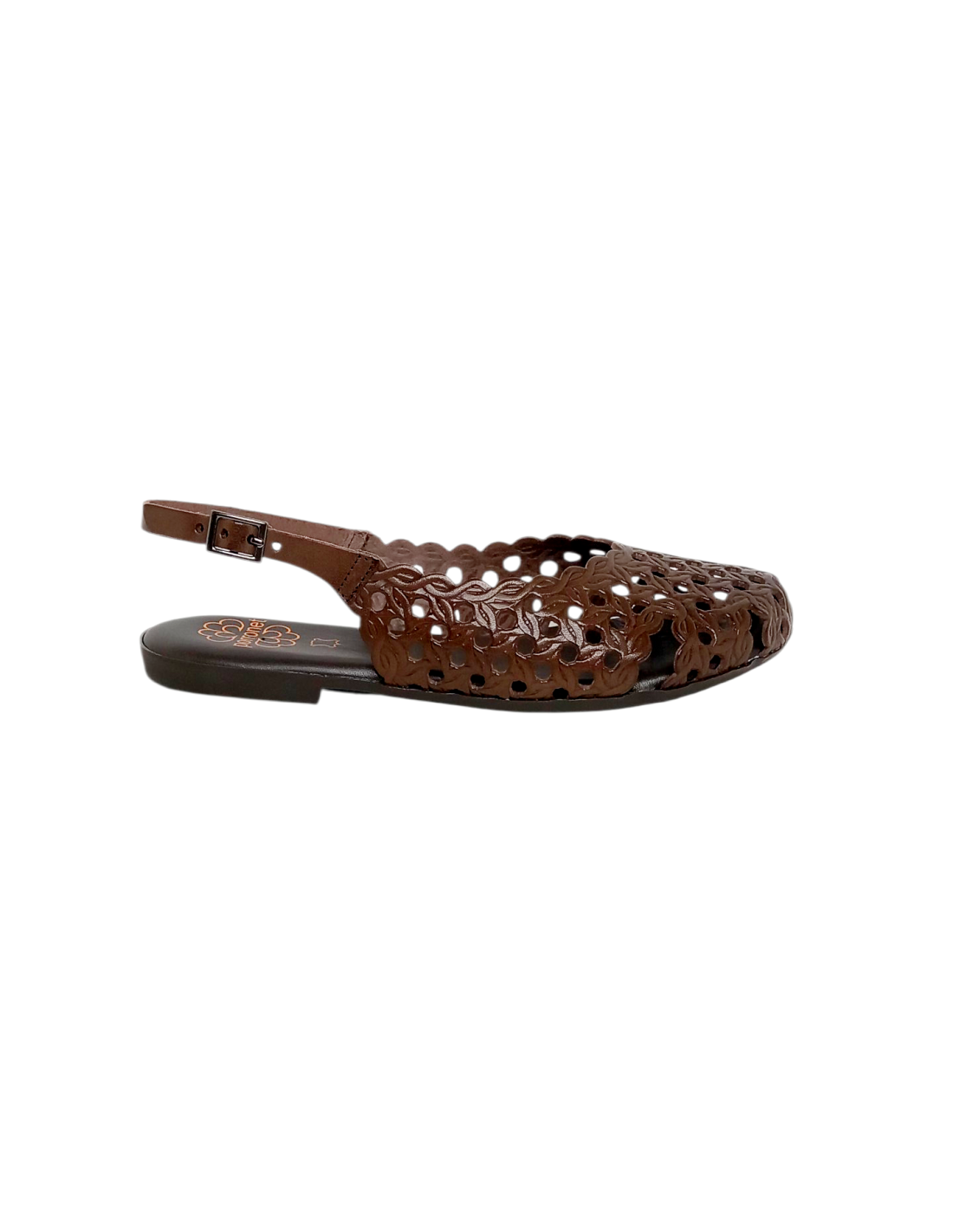 Sandalia plana cerrada por delante, destalonada y fabricada en piel troquelada en colores oro y marrón.