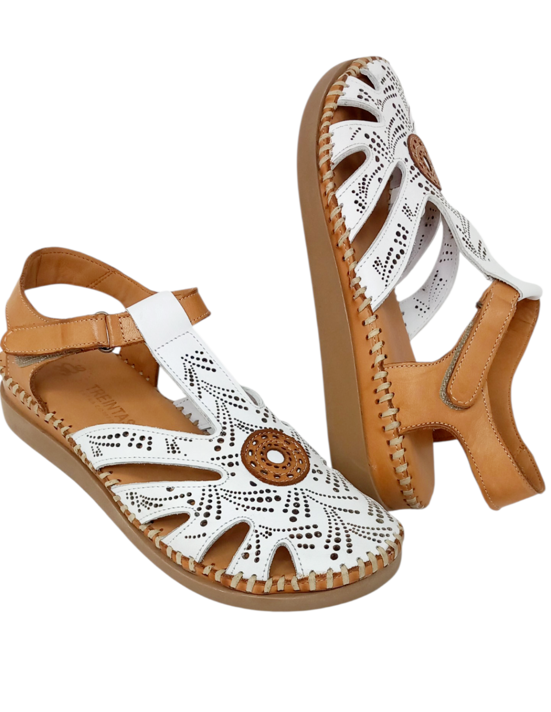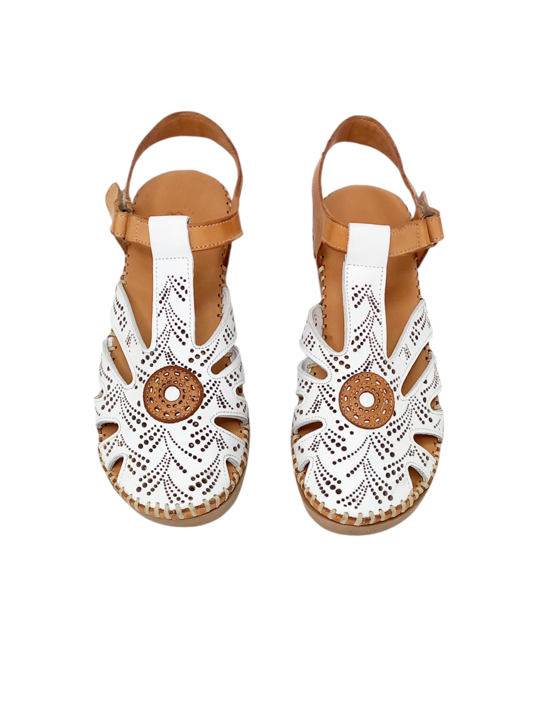 Sandalia cerrada por delante, fabricada en piel troquelada que combina los colores blanco y cuero.