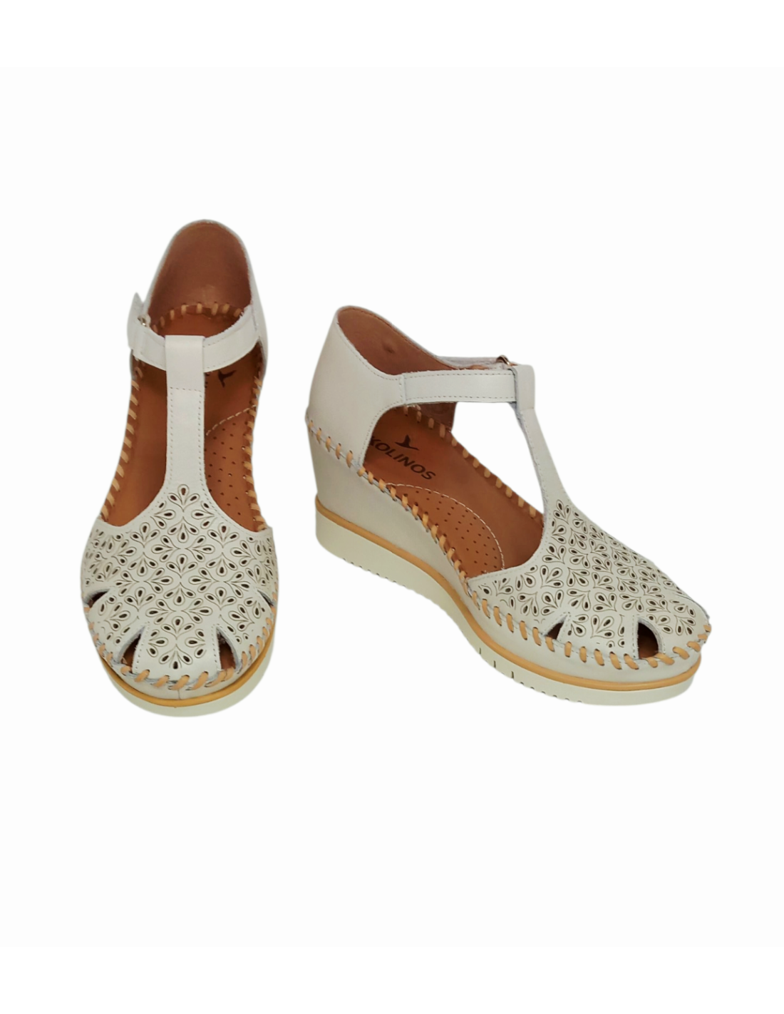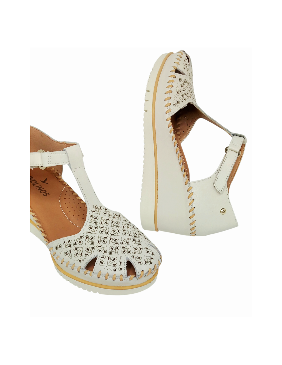 Sandalia semicerrada fabricada con piel de vacuno y caprina de color nata con brocados en la parte delantera.
