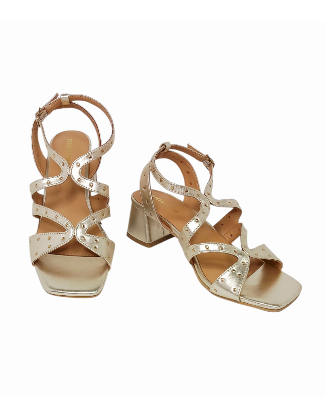 Sandalia de tacón fabricada en piel metalizada de color dorado champán adornada con pequeñas tachuelas doradas.