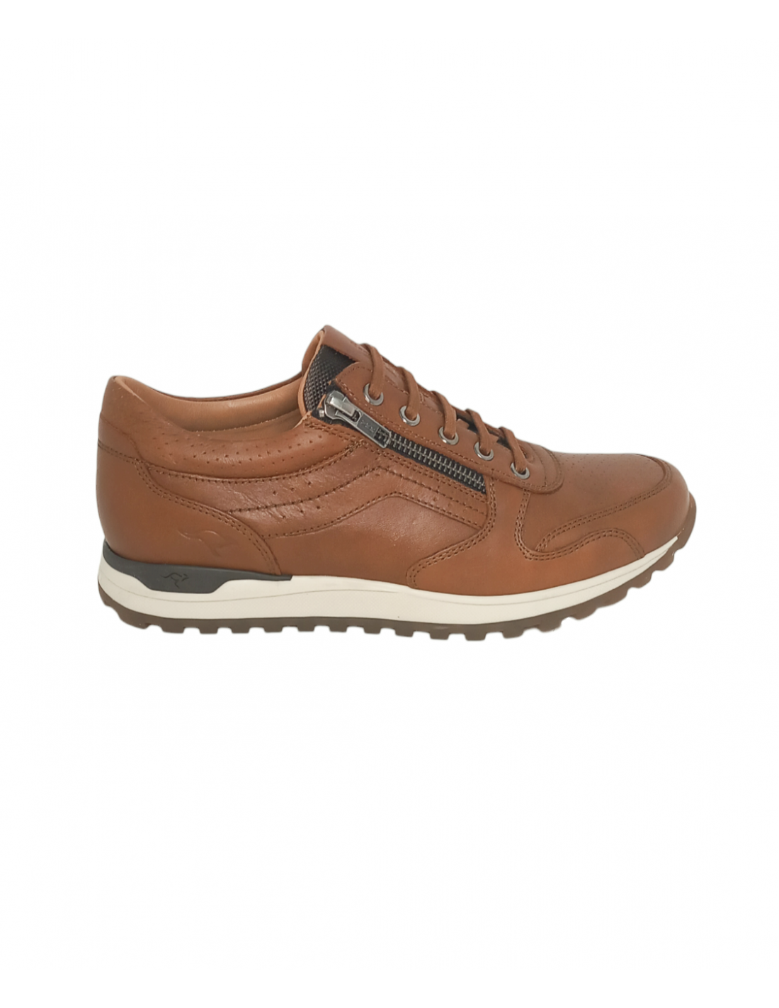 Zapato sport en piel color cuero, cierre mediante cordones en los mismos tonos que el zapato y cremallera exterior, para facilitar el calce sin tener que atar.