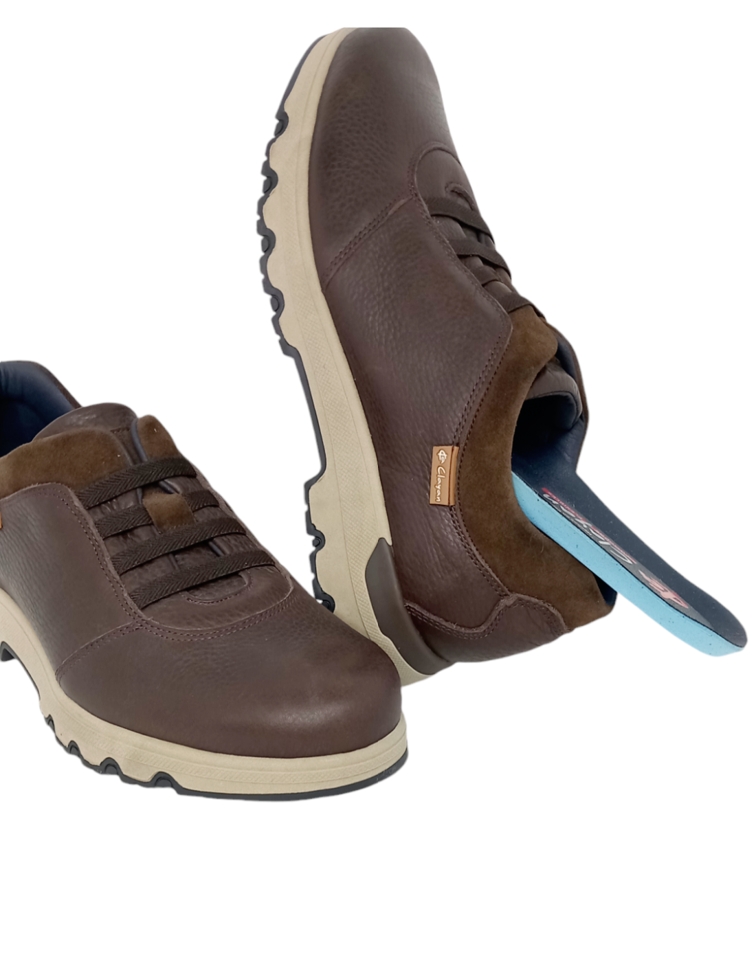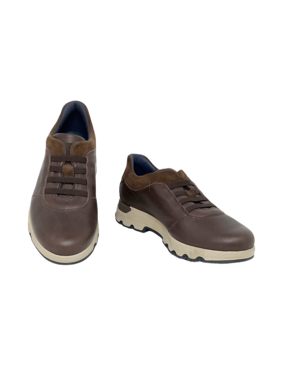 Zapato de estilo sport fabricado en piel color marrón. El cuello además de ser acolchado, es de ante, haciendo un bonito contraste con el cambio de textura con respecto al resto del zapato.