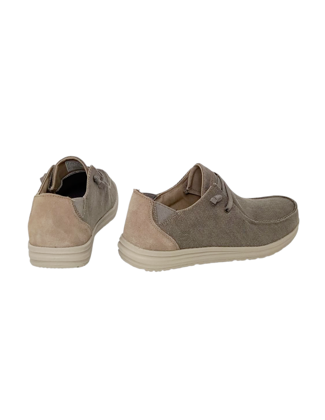 Zapatilla de lona tipo mocasín en color taupe, con paneles laterales elásticos dobles y cierre de cordones elásticos, que facilitan su puesta, evitando tener que atar y desatar en cada puesta.
