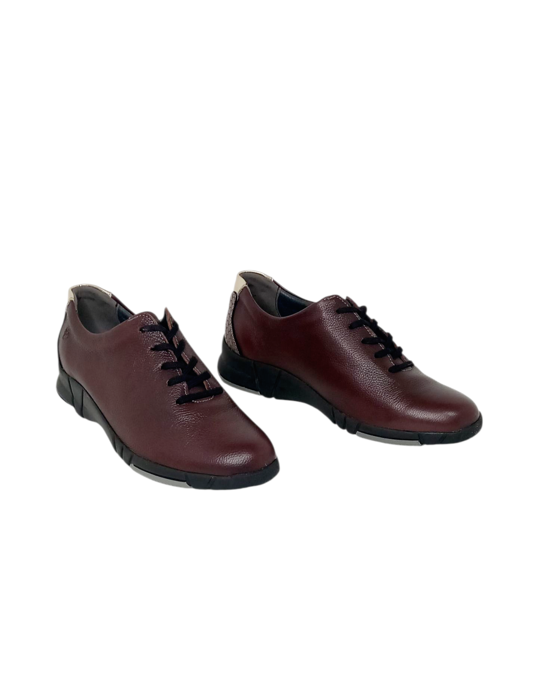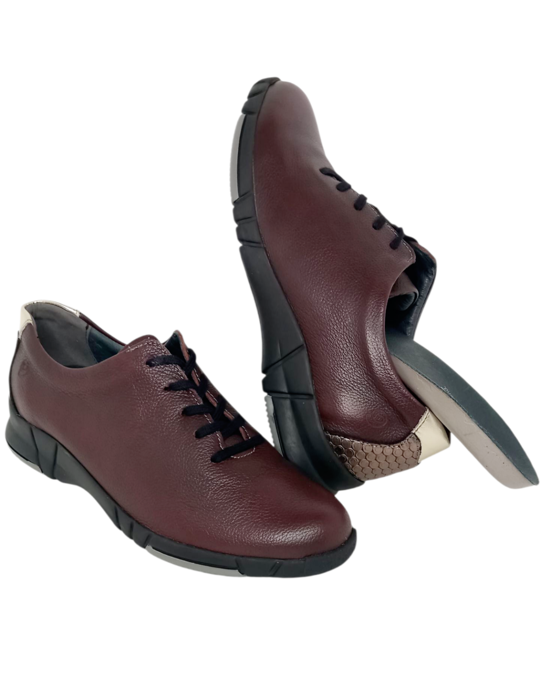 Zapato en piel lisa de primera calidad en colores burdeos con detalle dorado en el talón, con cierre de cordones para favorecer su calce, interior en piel y textil, con plantilla acolchada anatómica extraíble.