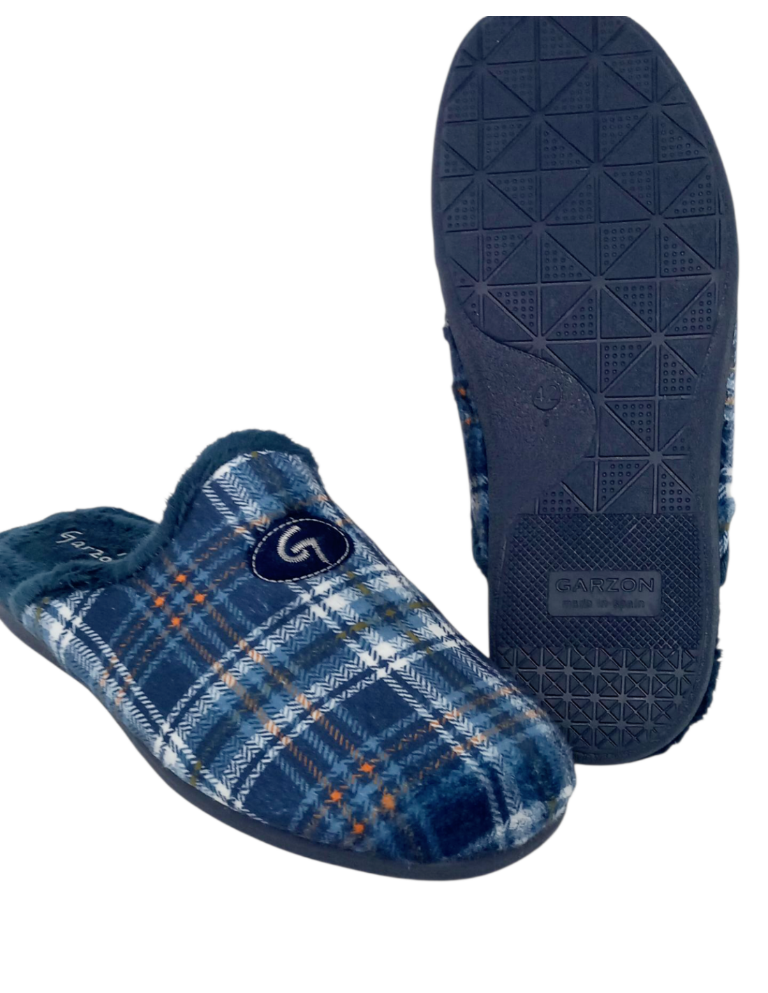 Zapatilla de casa abierta por atrás, confeccionada en material textil aterciopelado muy suave y calentito, en tonos azules con estampado de cuadros.