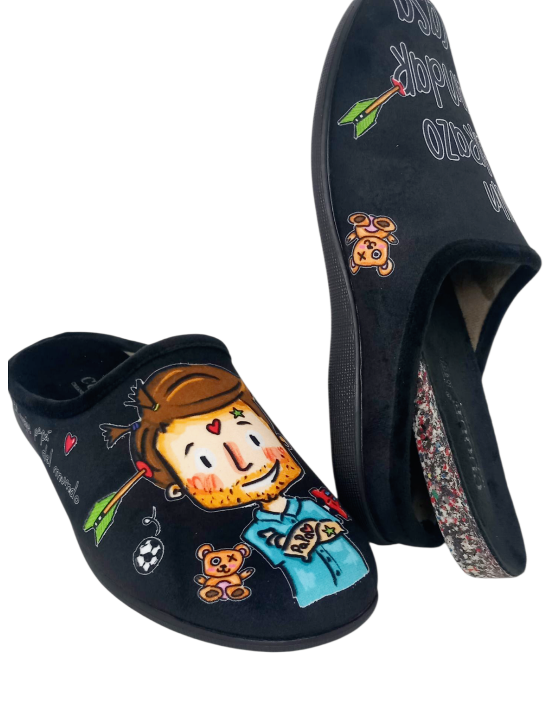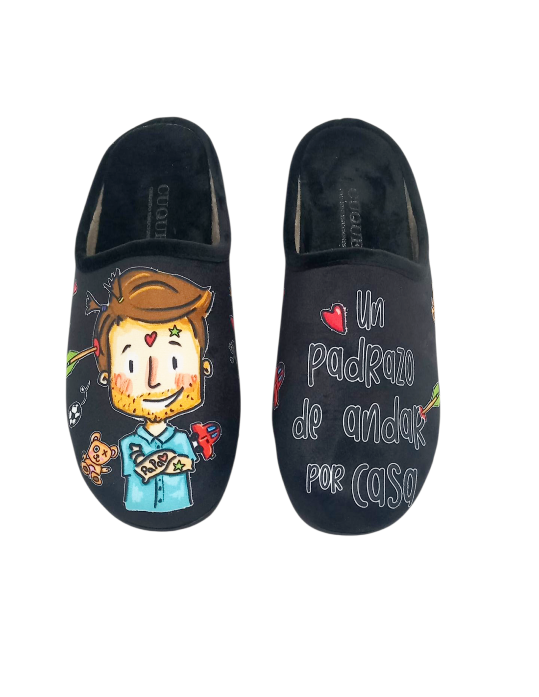 Zapatilla abierta por atrás, fabricada en paño suave en color negro con divertido diseño de un dibujo feliz de papá en un lado y un divertido texto de "un padrazo de andar por casa" en el otro.
