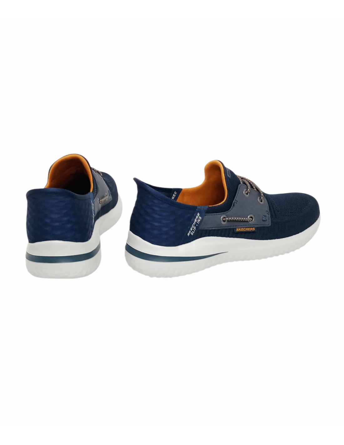 Zapatilla de lona tipo náutico en color azul marino. Es un modelo de la línea Slip-Ins, es decir, que te permitirá calzarte sin agacharte, gracias a incorporar una almohadilla llamada Heel Pillow exclusiva en el talón, que además de facilitar el calce mantiene el pie en su lugar de forma segura y cómoda. Además dispone de plantilla Air-Cooled Memory Foam con amortiguación en la pisada.