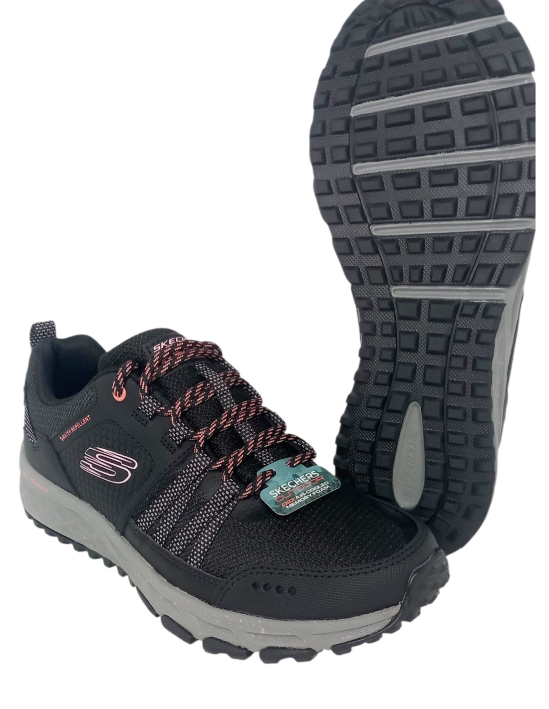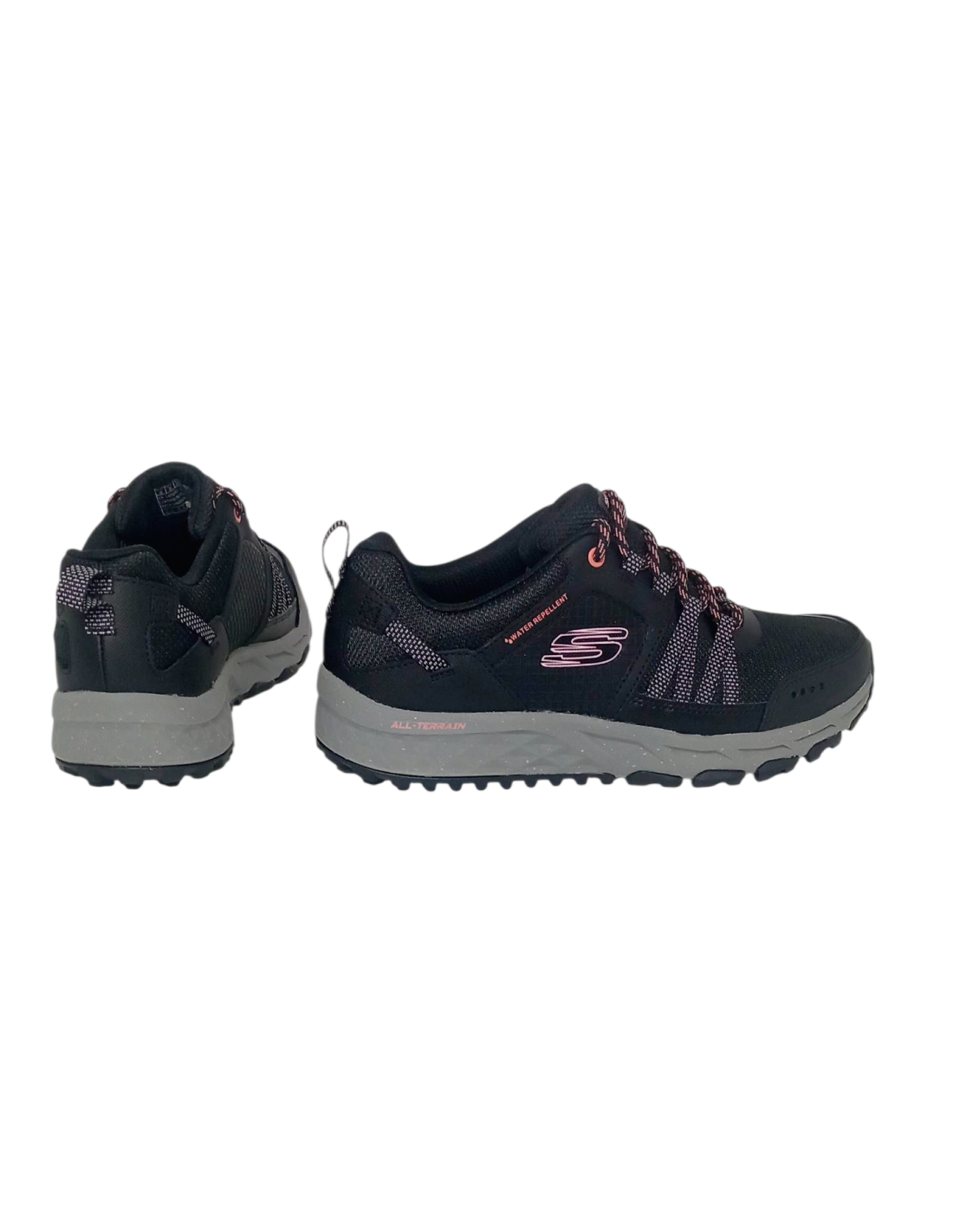 Zapatilla deportiva tipo trail Skechers Escape Plan en color negro con detalles en rosa. Este modelo está fabricado en la parte superior en piel sintética y malla resistentes al agua.