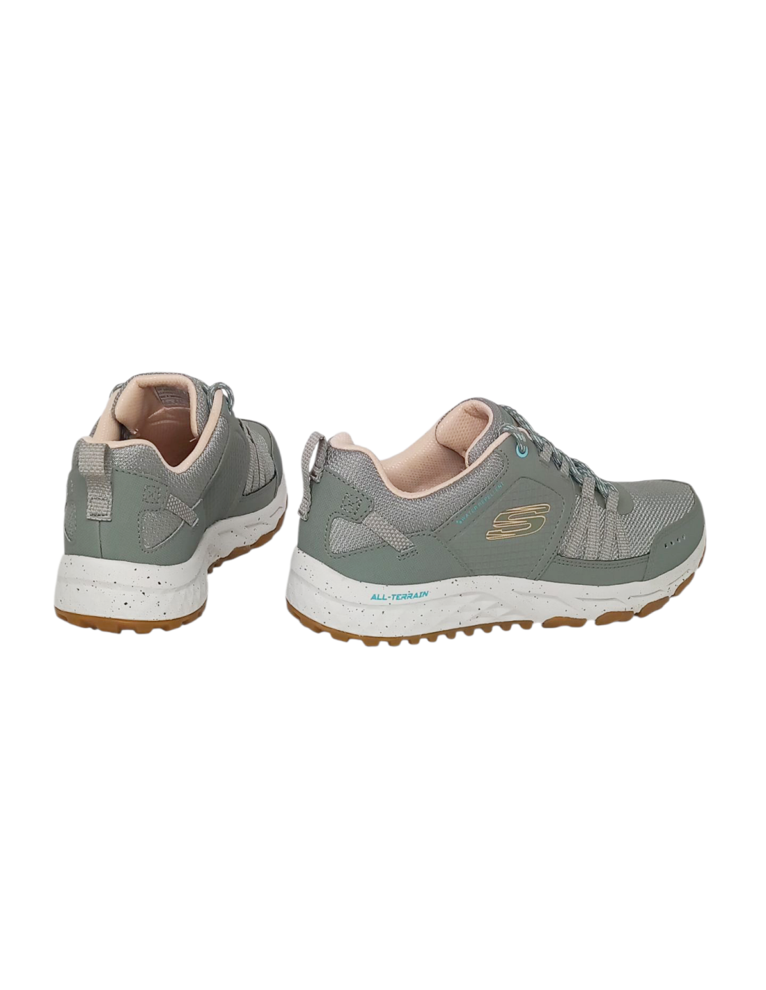 Zapatilla deportiva tipo trail Skechers Escape Plan en color verde agua con detalles en salmón. Este modelo está fabricado en la parte superior en piel sintética y malla resistentes al agua.