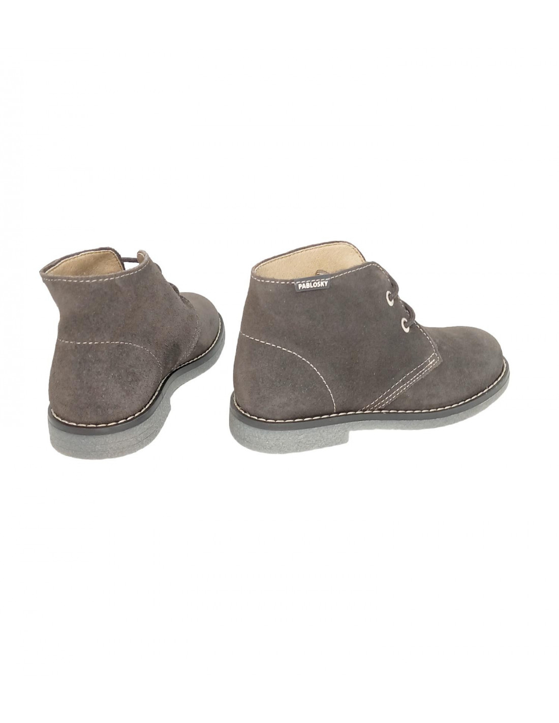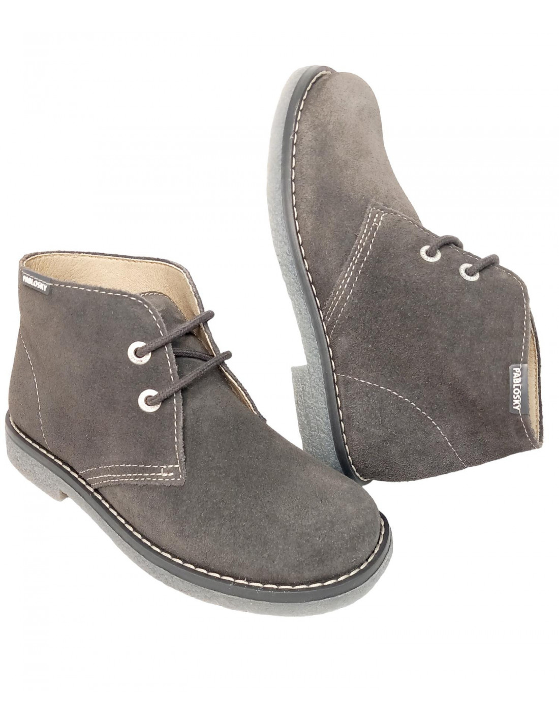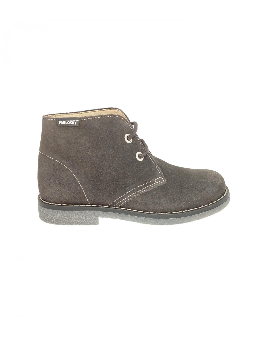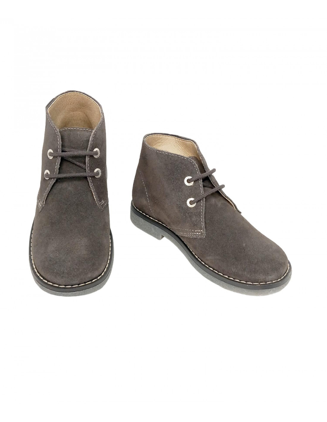 Bota de piel serraje natural que garantiza la correcta transpiración del pie y cuenta con el certificado ambiental LWG, en color gris con cierre mediante cordones centrales.