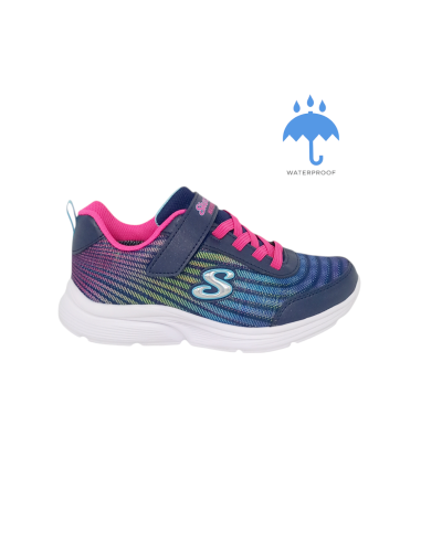 Deportivo con parte superior de malla y material sintético en color azul marino jaspeado con detalles multicolor en fuxia, amarillo, verde agua, etc. Este es un modelo WATERPROOF, puesto que el interior viene forrado con una membrana impermeable y las costuras están selladas.