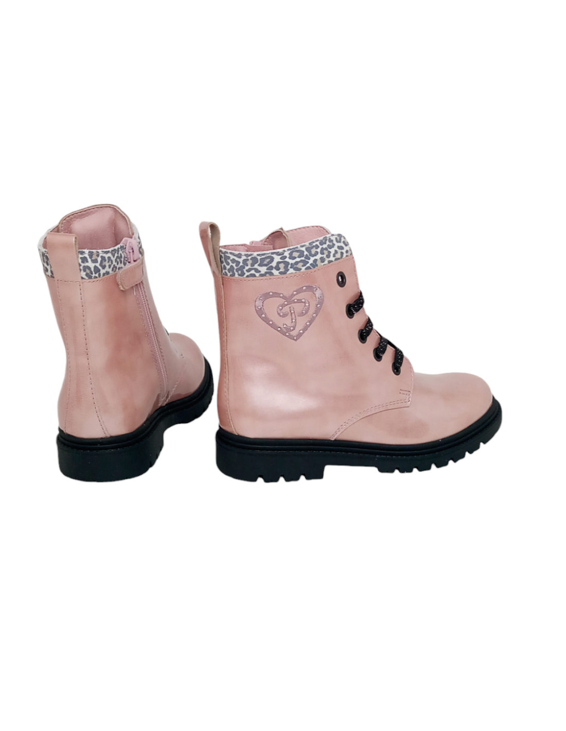 Bota de estilo militar, en color rosa con el lateral adornado con la "P" de Pablosky y un corazón bordados en gris. Además lleva un ribete de animal print de leopardo en la parte superior.