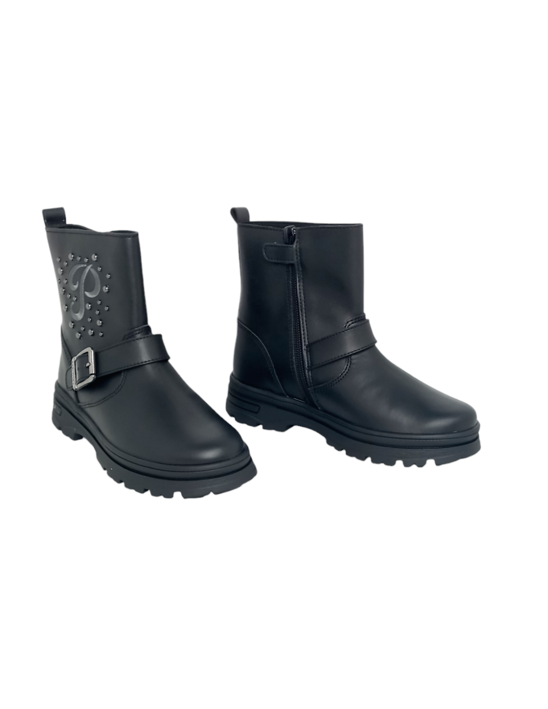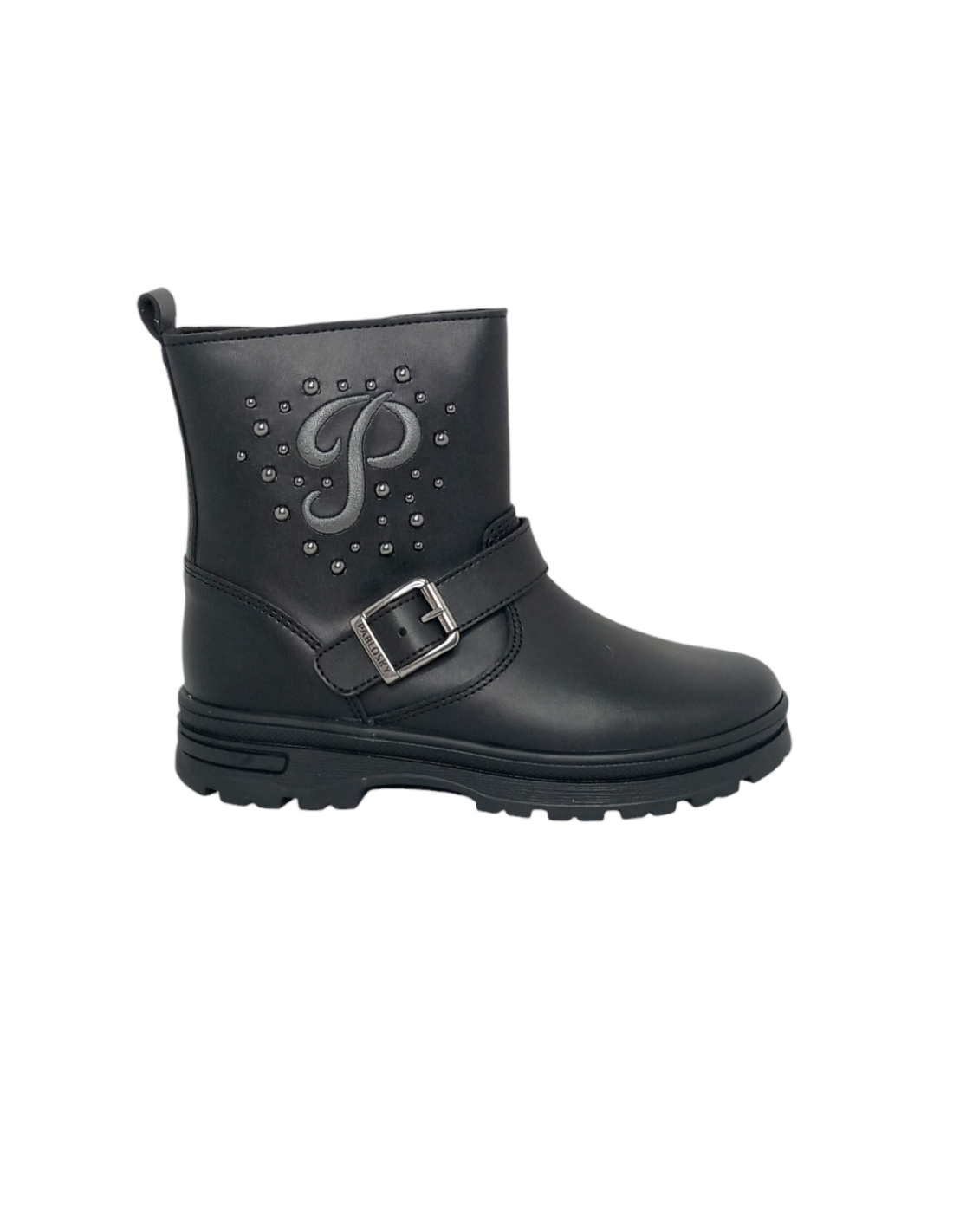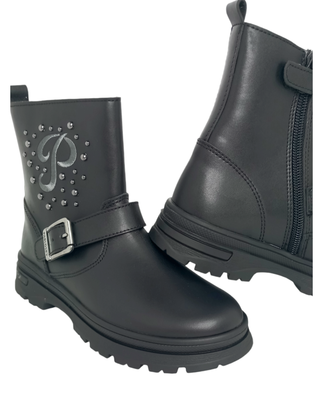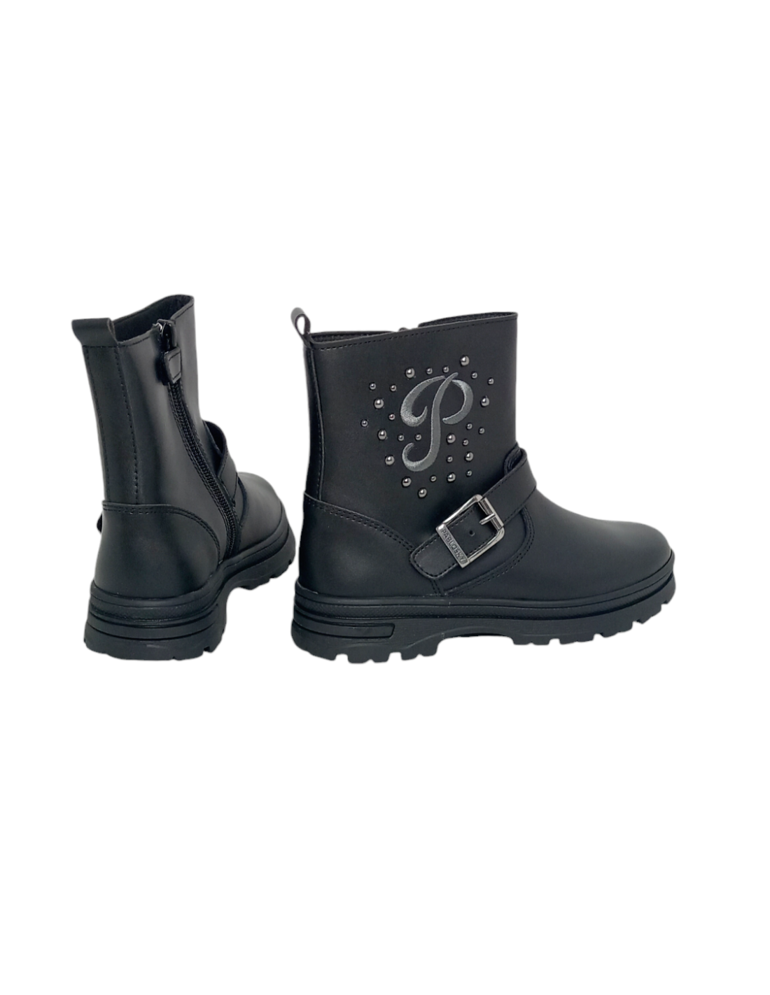 Botín de estilo militar, en color negro con el lateral adornado con tachuelas plateadas y la "P" de Pablosky bordada en gris.