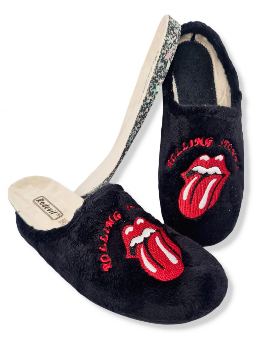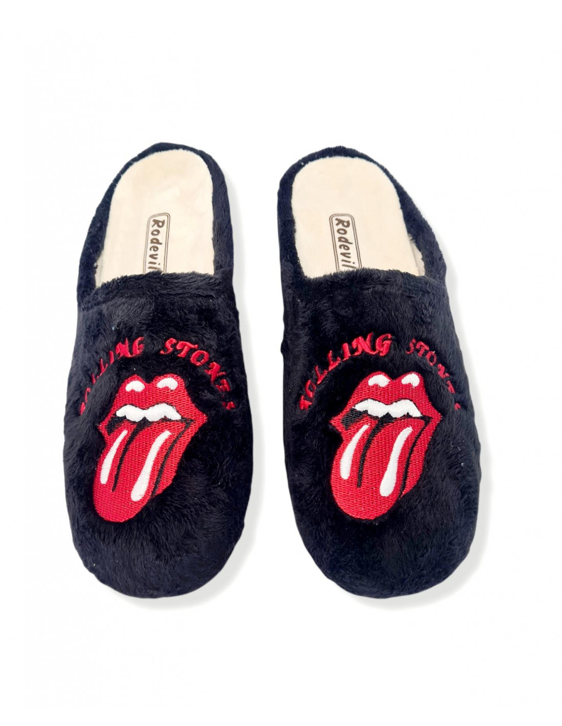 Zapatilla descalza confeccionada en textil suave aterciopelado, en color negro con logo de los Rolling Stones en la parte superior. Plantilla extraíble en paño suave y suela de goma flexible y antideslizante.