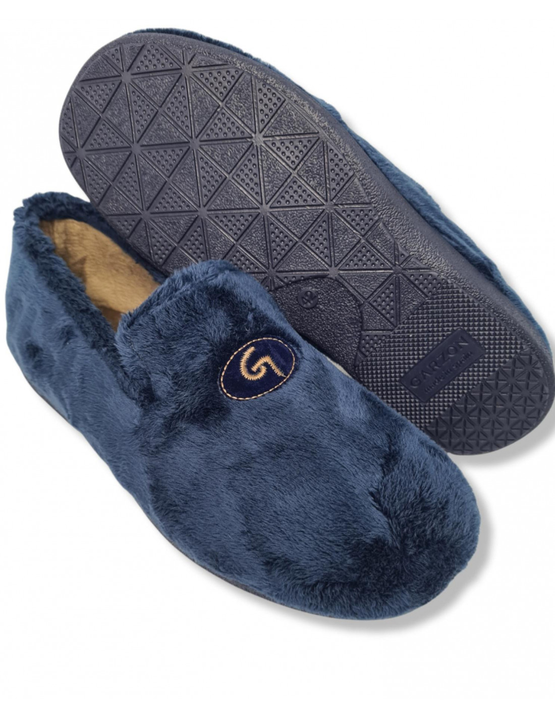 Zapatilla de casa cerrada por detrás, confeccionada en material textil aterciopelado en color azul.