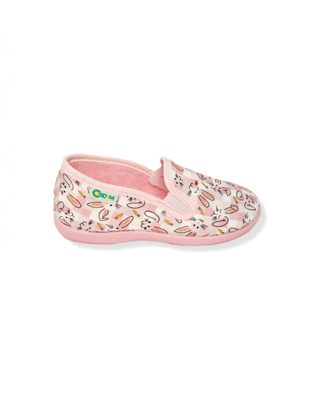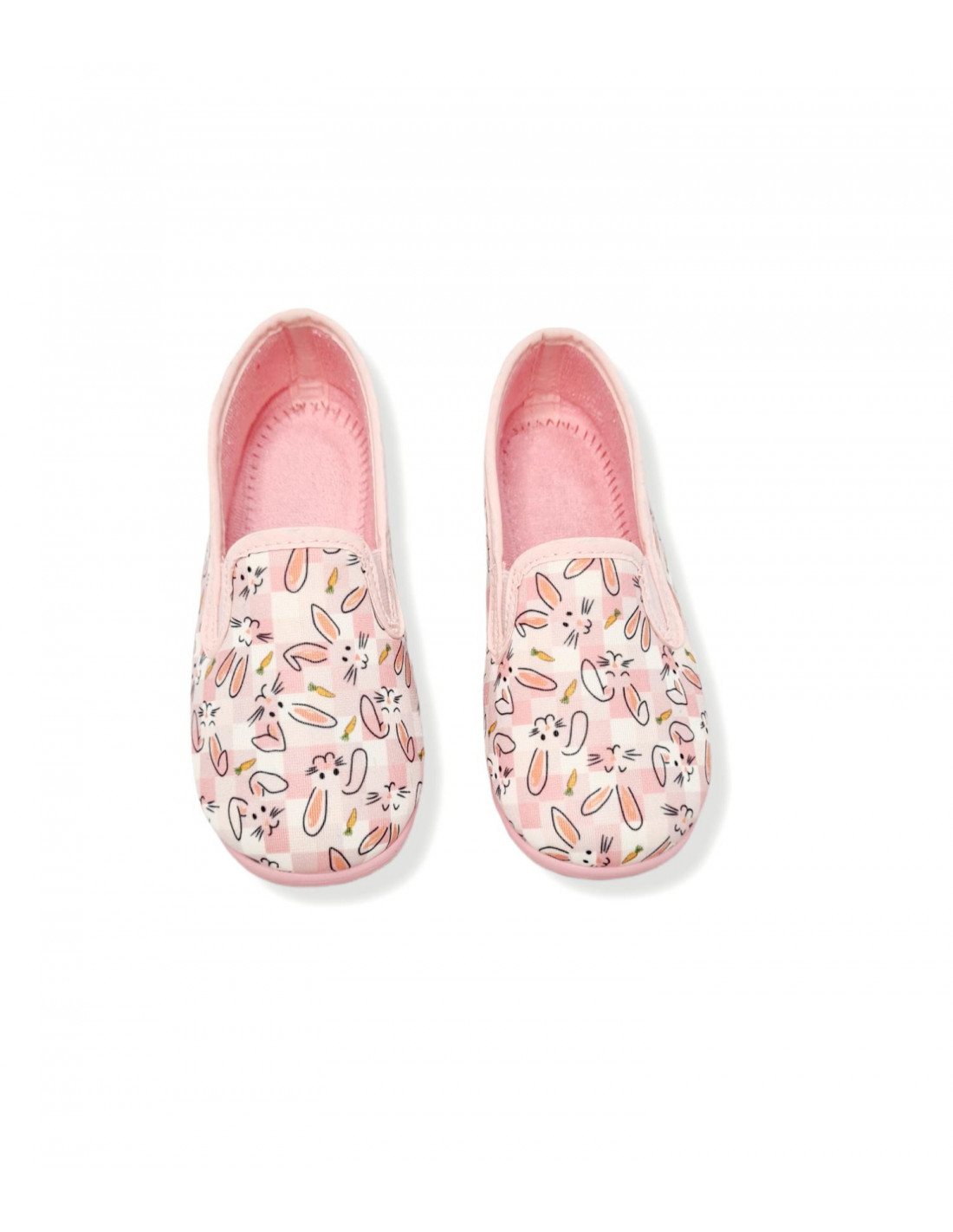 Zapatilla cerrada en color rosa y blanco con diseño de conejitos y zanahorias. Incorpora fuelle de goma en los laterales del empeine para una mayor adaptabilidad y sujeción del pie. Forro en textil para favorecer la transpirabilidad y suela de goma.