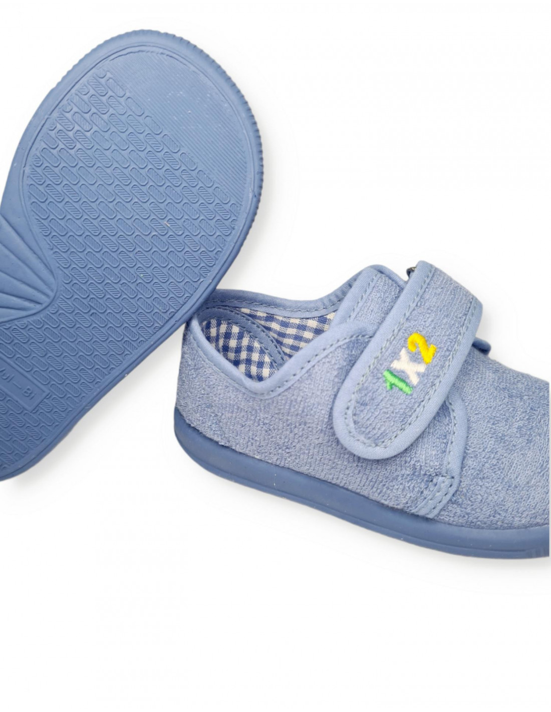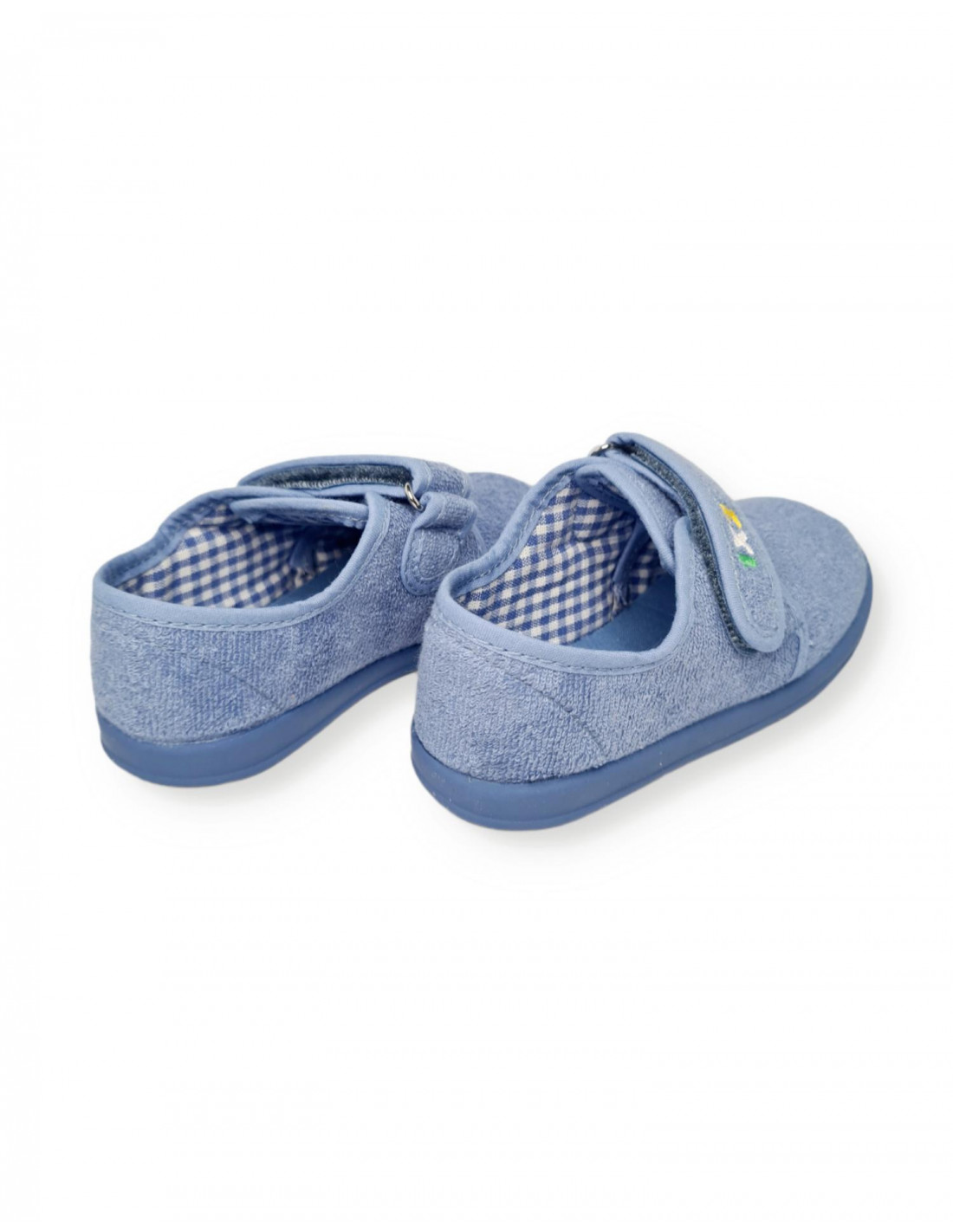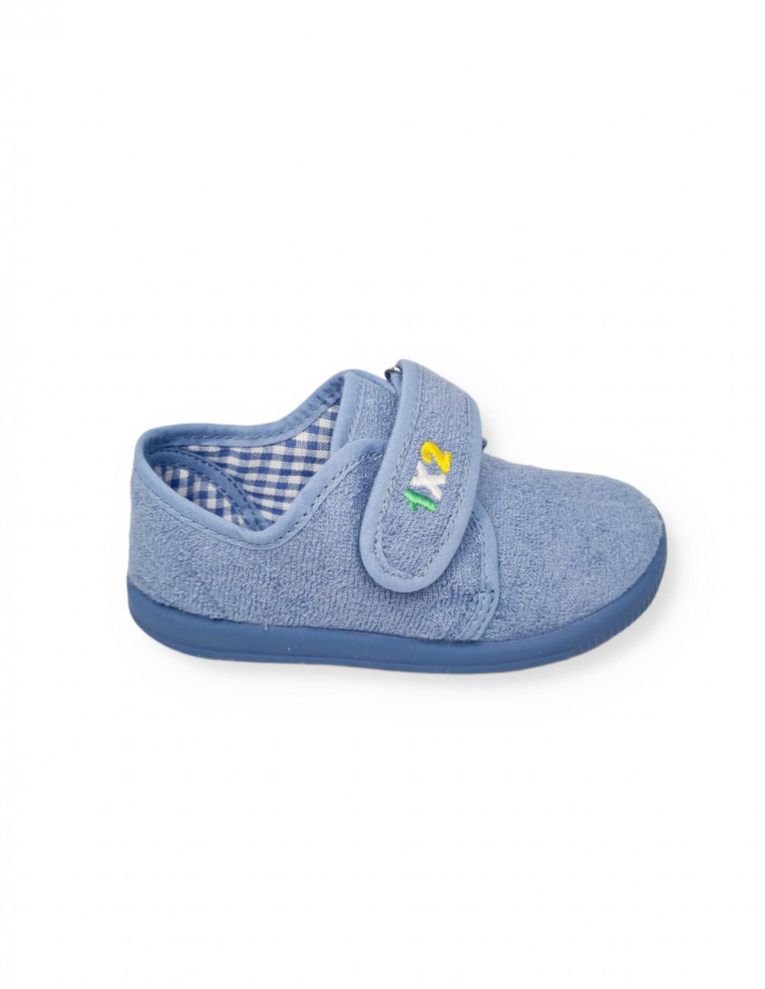 Zapatilla de casa de rizo de algodón en color azul celeste con bordado de colores verde, blanco y amarillo (1 x 2). Cierre de velcro para una buena sujeción del pie.
