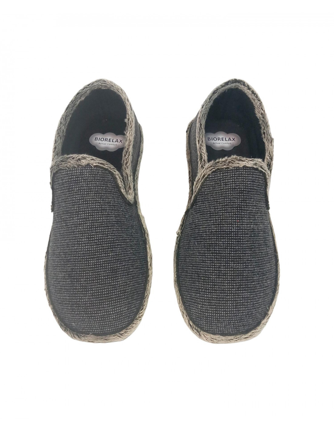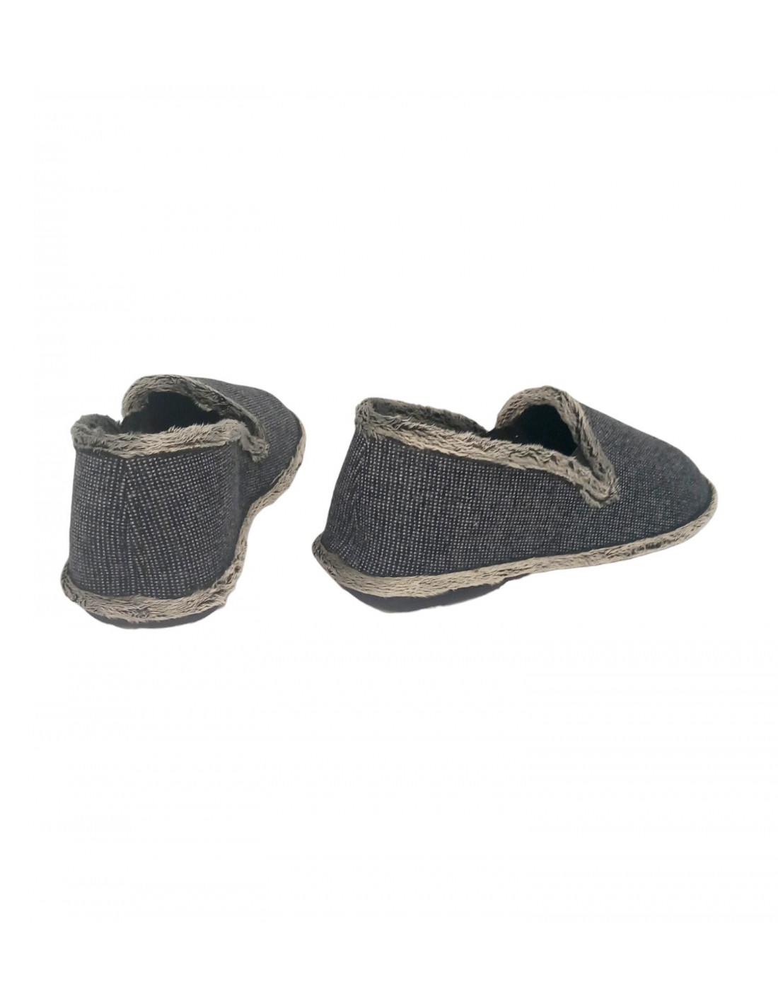 Zapatilla de casa color gris jaspeado con ribete en gris claro, cerrada con pequeñas aberturas laterales para un buen calce y plantilla acolchada. Fabricada en tejido suave y calentito transpirable y suela de caucho antideslizante de máxima calidad.